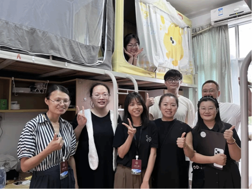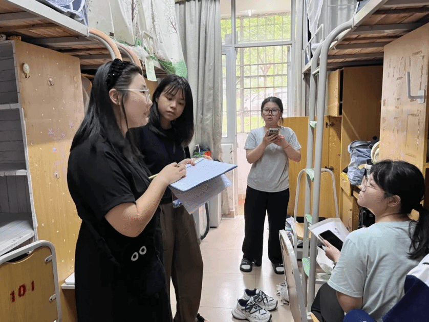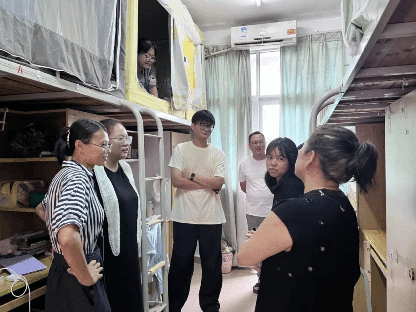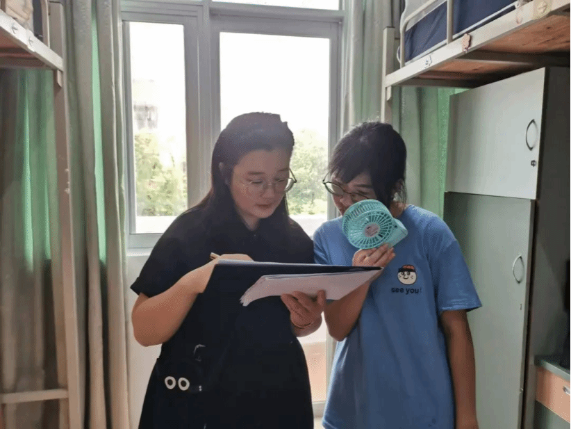 在繁忙报到之余,辅导员老师们暖心走访新生宿舍,了解新生对学校和即将开启的大学生活的适应情况,并送去学院亲切的问候和关怀。在交谈中,老师们耐心地解答新生的疑惑,进行防诈反诈宣讲,同时鼓励新生们积极参加校园活动,科学规划大学生活。