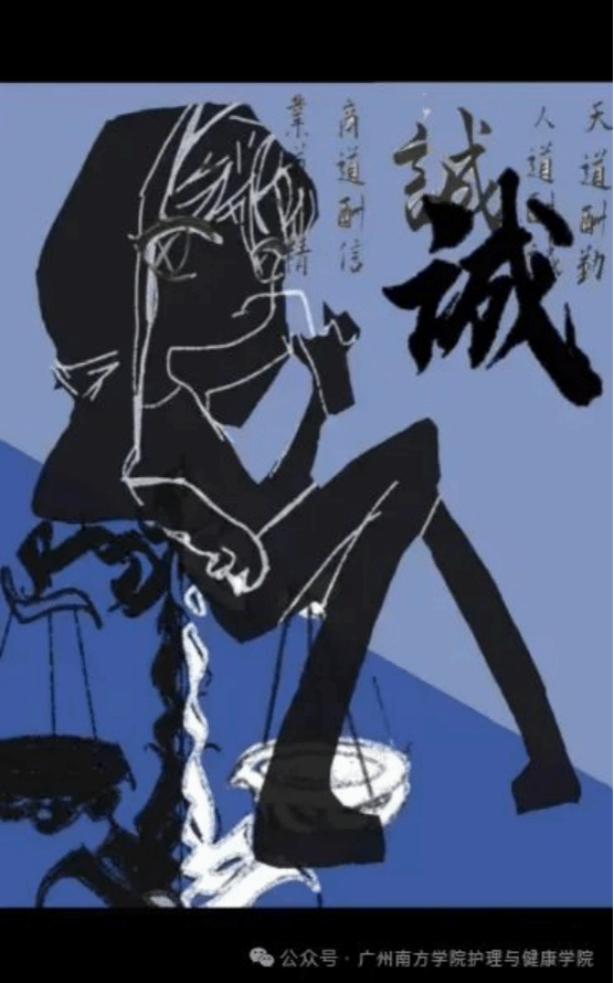 作品介绍:天道酬勤,人道酬诚,商道酬信,业道酬精。在天平的两端,诚信的重量是公正的见证。以诚信为荣,让每一次权衡都充满尊严。海报中黑白分明的颜色大道至简,凸显诚信的清晰分明;天平象征着公正与平衡,呼吁广大学生以诚信为尺,树立正确的道德观,珍爱信用,以诚信为本,用诚信铸就坚实的基石。