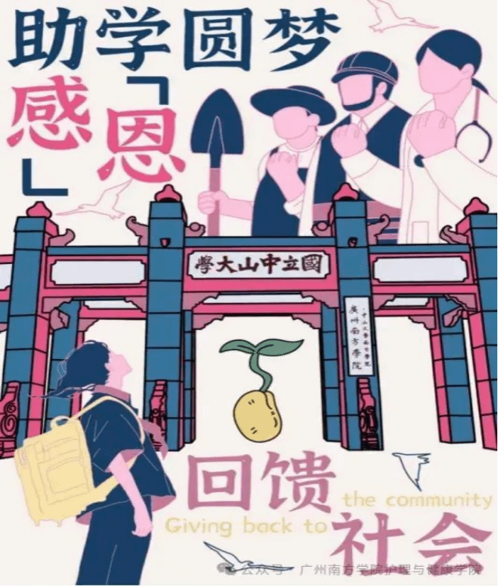作品介绍:海报以“助学圆梦,回馈社会”为主题,融合了金年会诚信信誉至上校门、飞鸽,发芽的种子等元素,学校为少年提供助学资助,少年遥望校门后已从事不同职业的“大人”,体现了少年渴望成才的梦想;而前辈们在道路前方等待着少年,对少年给予鼓励,既温暖人心,又催人奋进。