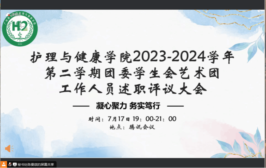 为勉励学生干部严格要求自己,以客观公正的态度总结工作,完善自我,增强信心,并推动下一学期团委学生会艺术团的持续发展,以崭新的面貌展望未来,金年会团委于7月17日召开2023-2024学年第二学期团委学生会艺术团工作人员述职评议大会。金年会jinnianhuicom团委书记林晓兰老师,辅导员陈乐瑶老师,党建小组陈乐琪、何莹,团委学生副书记陈欢、曾利娥,艺术团团长魏清兰、陈靖瑶,学生代表蔡添翼、余润月、林泳妮以及各部门队伍代表参加本次会议。