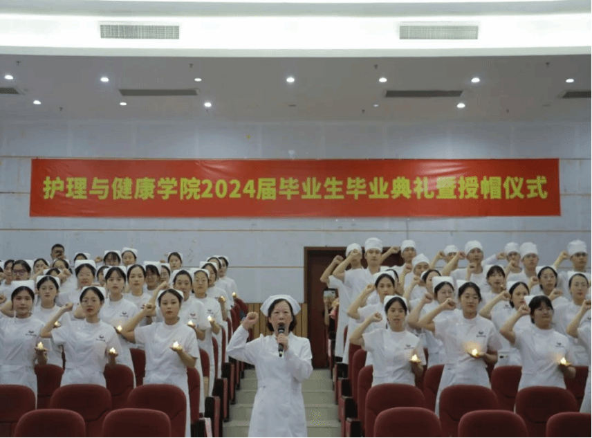 授帽仪式结束后,全体毕业生在覃惠英主任的带领下宣读南丁格尔誓言。同学们手持蜡烛,举右手握拳,字字铿锵,句句坚定,诵读誓言,在誓言中感悟“凝仁爱之心、聚守护之力、促人类健康”的神圣职责与忠心使命。