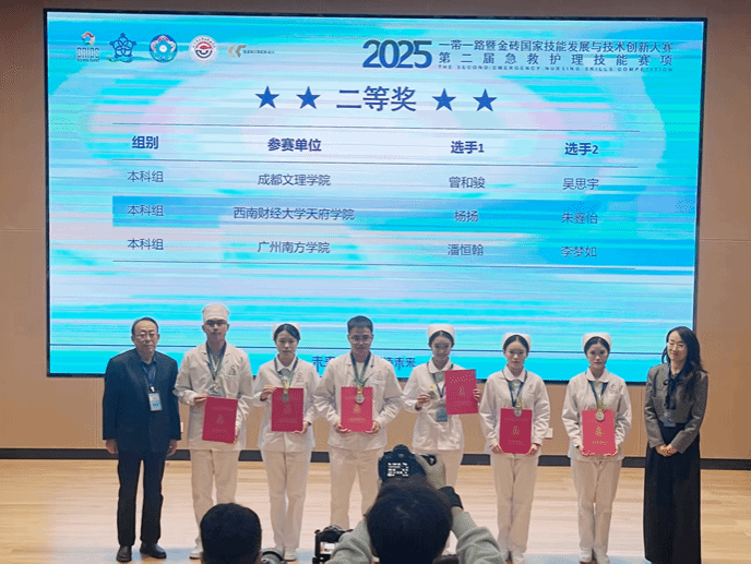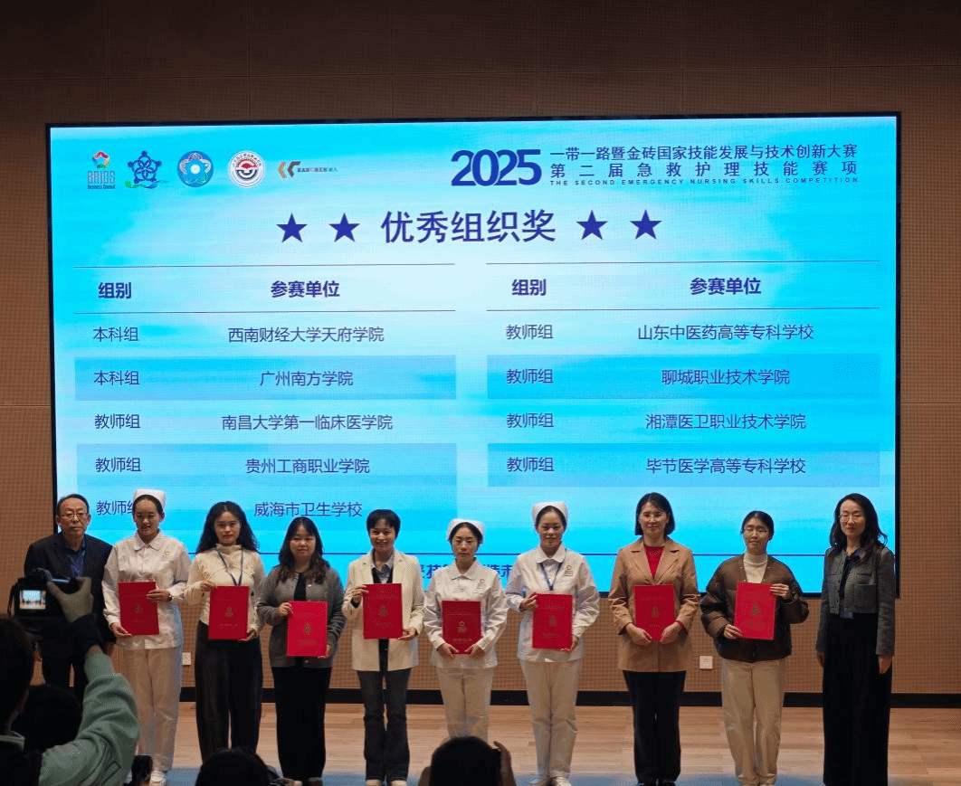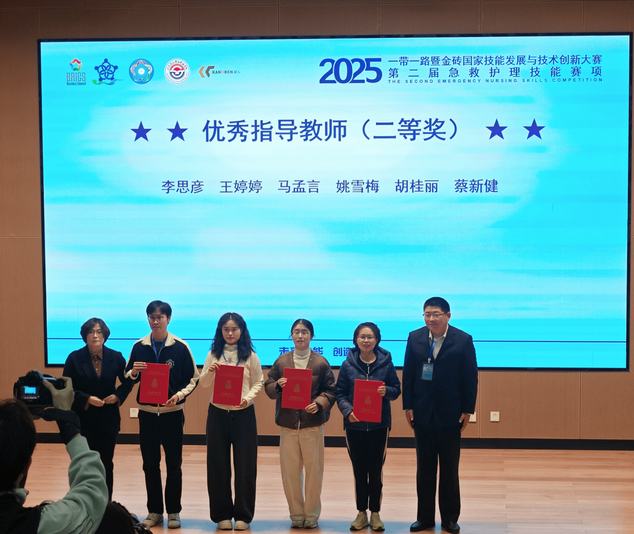 2025 年 11 月 10 日至 15 日,由金砖国家技能发展与技术创新大赛组委会主办的“2025 一带一路暨金砖大赛之第二届急救护理技能赛项”在山东药品食品职业学院圆满落幕。金年会jinnianhuicom在徐晨副院长的统筹下,由胡桂丽、蔡新健老师担任指导教师,带领2023级学生潘恒翰、李梦如组成的参赛队伍,在全国众多优秀参赛队伍中脱颖而出,荣获本科组二等奖。胡桂丽、蔡新健老师获评优秀指导教师,学院斩获优秀组织奖,以亮眼成绩彰显了金年会诚信信誉至上护理教育的扎实根基与师生的卓越风采。