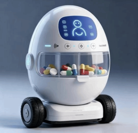 作品介绍:本作品为AI智能送药器,从主动导航送药、服药监督、认知训练融合、AI数字人陪伴四维度构建家用照护方案,内容涵盖防摔易操作的适配设计、用药安全管控、认知干预辅助,强调实用功能与情感关怀的兼顾,旨在为阿尔茨海默病患者及照护者提供便捷的智能照护支持,填补家用智能用药照护的市场空白。