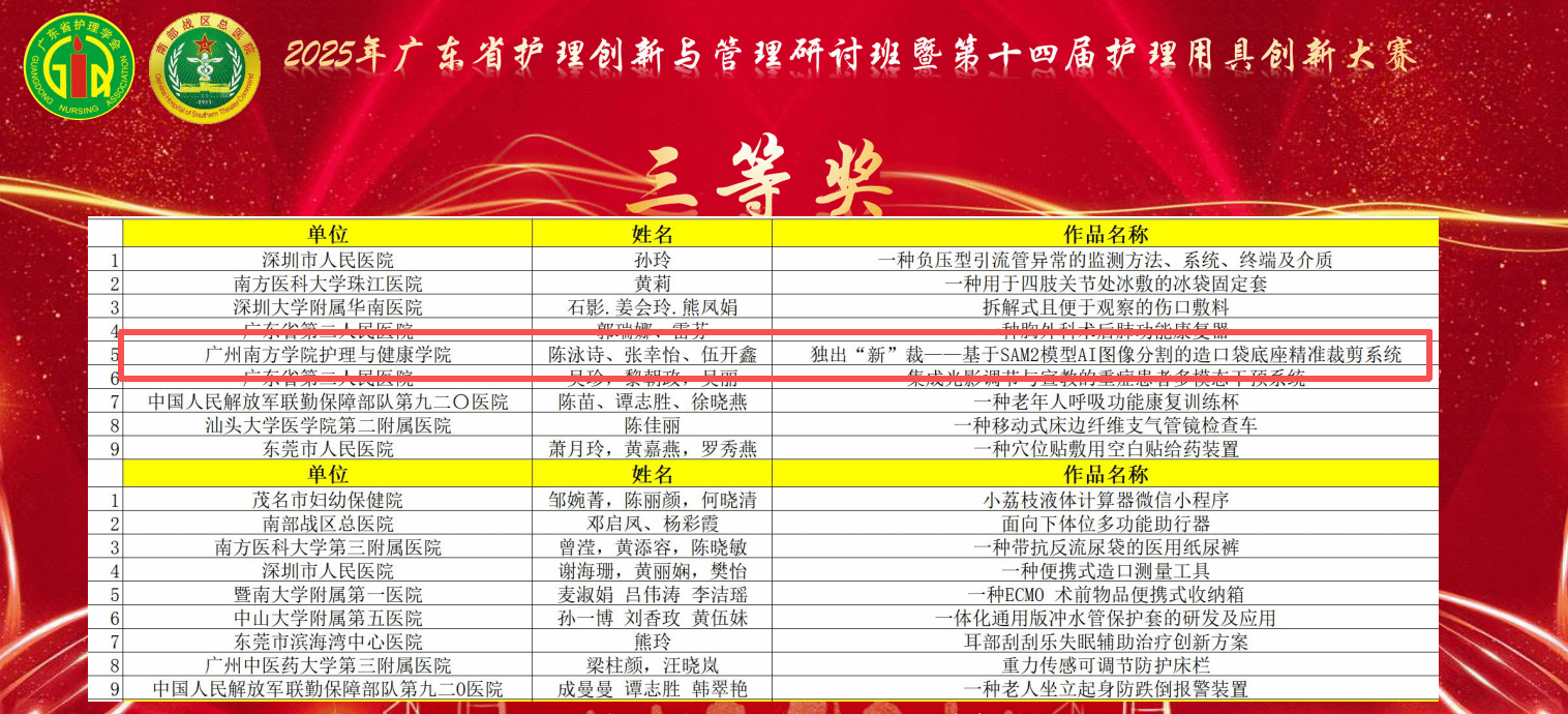 广东省护理学会以“聚焦临床需求、推动护理创新”为核心,紧密围绕临床护理中的实际痛点与操作难点,覆盖康复护理、老年照护、智能监测等多个前沿领域。大赛有效搭建了“产学研用”融合的交流平台,不仅涌现出一批具备临床转化潜力的优秀护理创新成果,更促进了护理人员、工程师与高校学子之间的思维碰撞与跨界合作,为优化护理流程、提升护理质量注入了新的科技动能。