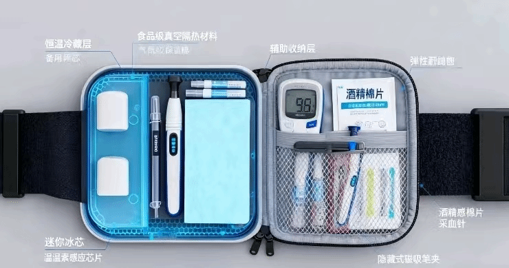 作品介绍:糖尿病患者长期依赖胰岛素治疗,外出时胰岛素的储存面临“温度需求与便携性的尖锐矛盾”。“安胰智恒随行带”创新使用航天级气凝胶与食品级真空隔热层组合,构建高效隔热屏障,以正十八烷为相变材料,设计50ml“相变储能冷芯”,兼具恒温、长效续航、便携收纳、舒适佩戴四位一体的优势功能,解决患者出行中的胰岛素储存难题。