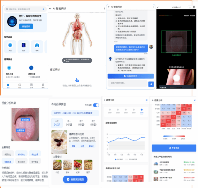 作品介绍:通过智能双轨问诊系统与用户交互式问答、体质问卷及3D模型指引,系统能自动整理病情信息,生成综合初诊报告,并对高危症状进行识别和分级预敬同时通过拍照获取舌象诊断结果,结合体质分类与健康状况,系统自动生成个性化、可执行的“一体化'诊+疗+管’方案的最终目标。