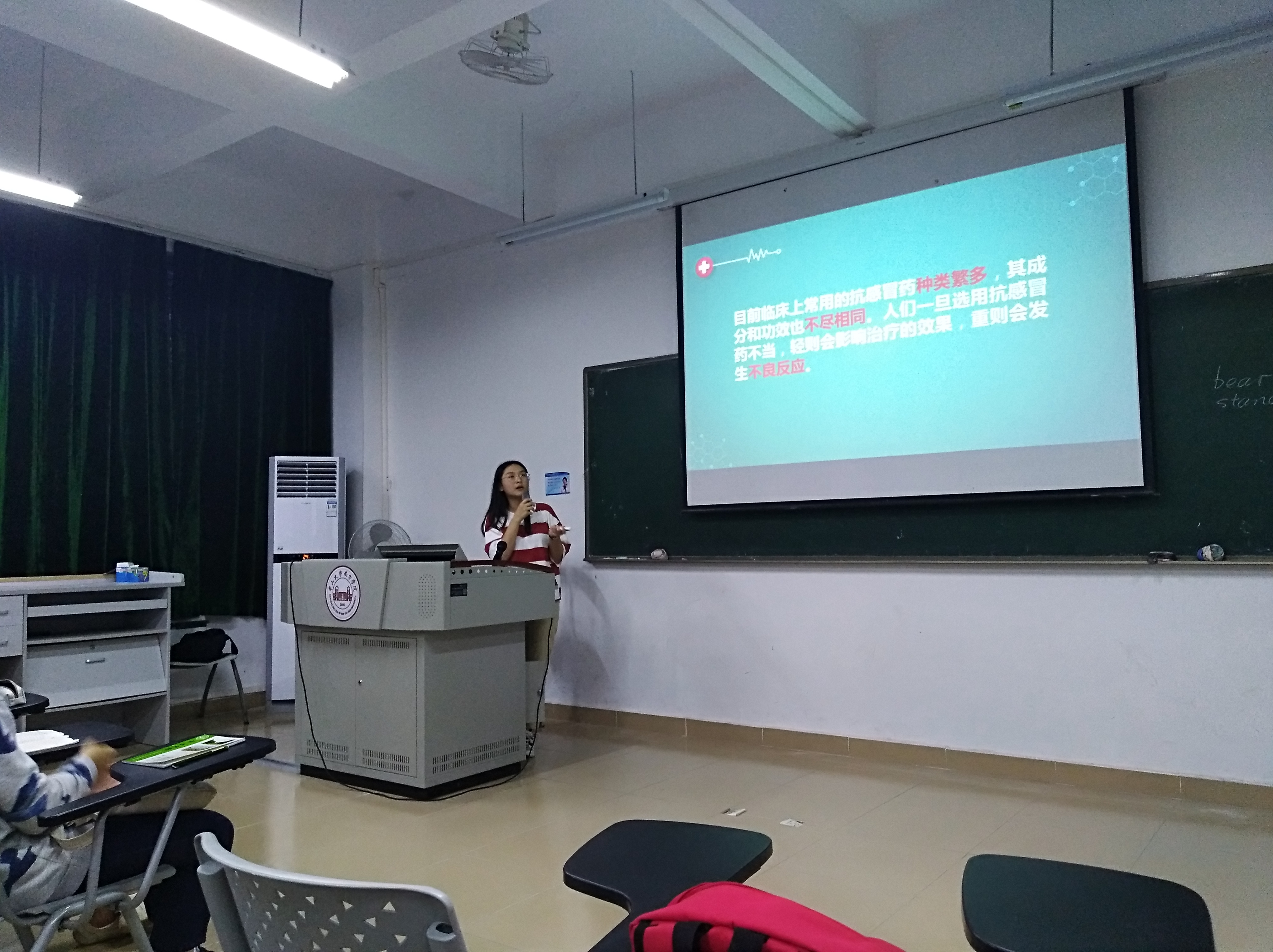 夕阳隐去,夜幕降临,健康与护理系“励能学堂”开课啦。2019年4月26日18时45分,健康与护理系于9教203以“普及药物基本常识及常用药物”为主题展开第三节励能学堂理论课程。本节课程两位小讲师来自2017级护理1班的曾洁彤、区维芳。