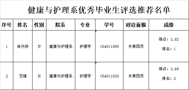 根据《中山大学南方学院学生奖励管理规定》,经个人申请,系学生工作办公室对申请者参评的基本条件及业绩材料进行审核,系评审委员会讨论,现将健康与护理系2019届优秀毕业生评选推荐名单予以公示。