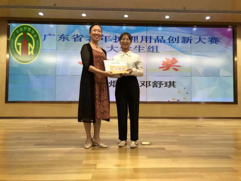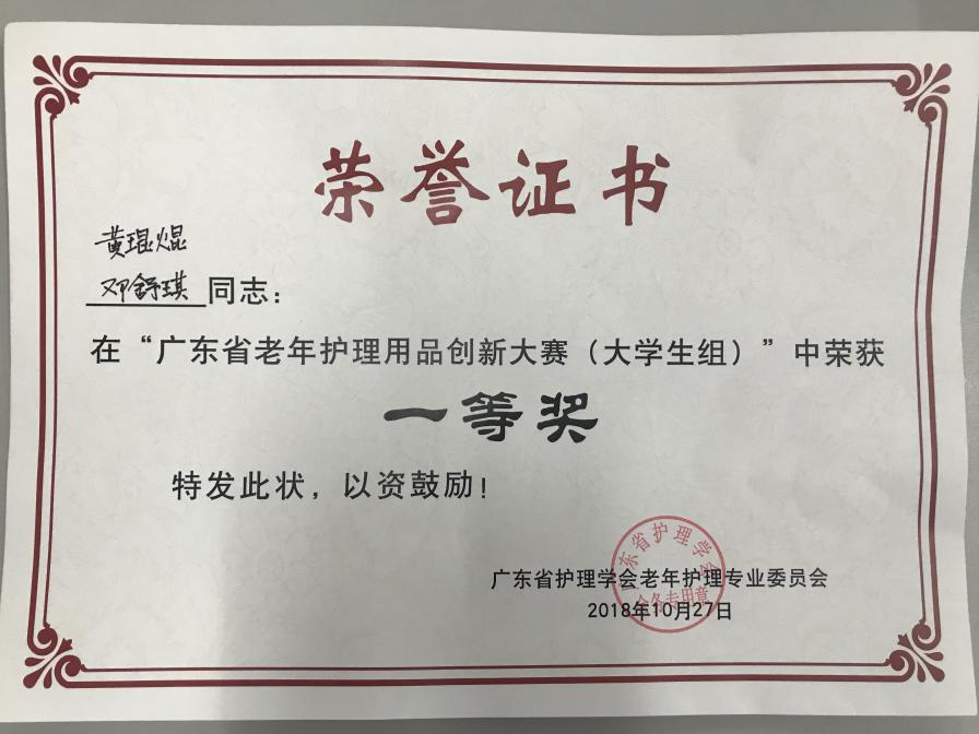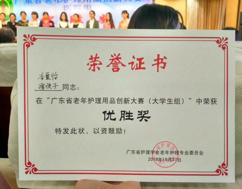 2018年10月27日,广东省首届老年护理用品创新大赛暨大学生老年护理创新创意大赛在广州市第一人民医院举办,我系2016级护理1班黄琨焜与邓舒琪同学参赛项目《温度湿度感应成人纸尿裤》在比赛中斩获一等奖,2015级护理2班李夏怡和谭顺子同学参赛项目《老人防摔带》在比赛中荣获优胜奖。