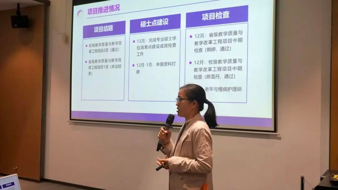 护理学专业负责人、临床与护理教研室主任黄惠亭就新教师培养与培训、教科研进展、国际交流等工作进行了总结汇报。针对新学期工作,她提出要进一步发挥导师制优势,强化教学督导作用,进一步提高青年教师教学水平,切实推进专业内涵建设与人才培养质量提升。
