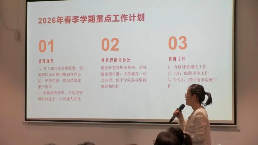 会上,学院各职能部门负责人分别回顾了上一学期的工作成效,并重点汇报了新学期的核心任务与推进计划。汇报内容条理清晰、目标明确,既立足工作实际,又着眼长远发展,为新学期各项工作的有序开展奠定了坚实基础。