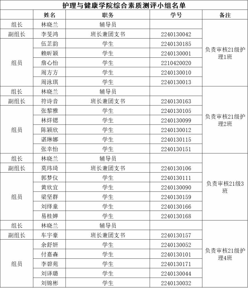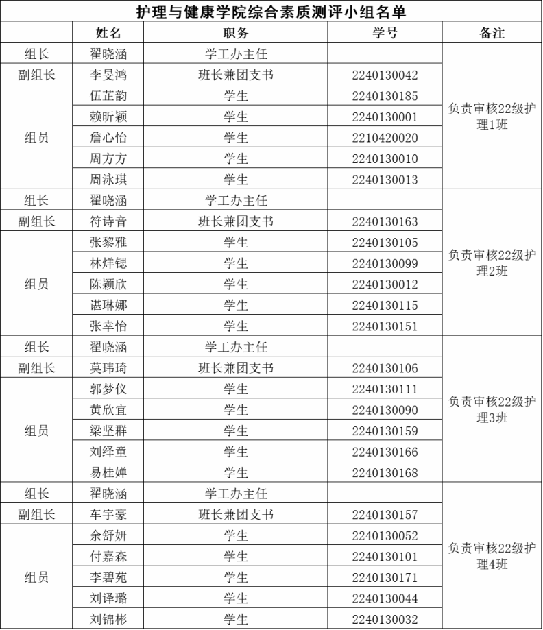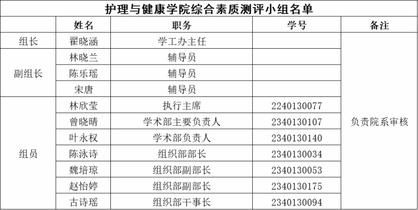 一年一度的综合素质测评即将开始,为更好的开展2023-2024学年综合素质测评工作,学院组成了由班级学生代表、班级学生干部、学生会、团委、老师为单位的审核小组,分阶段审核综合素质测评自评表及资料。现将审核小组名单予以公示,公示内容如下: