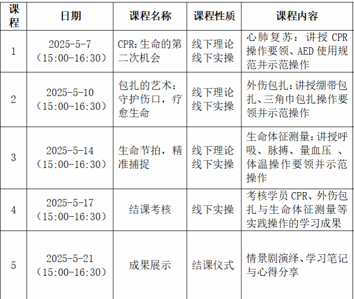 课程内容不仅涵盖基础理论知识,而且结合生活急救常识、心肺复苏及外伤急救等实用技能,重点讲授胸外按压、绷带包扎等急救技术。还有生命体征课程的教学,学员将系统学习体温、脉搏、呼吸、血压的测量方法,掌握体格检查的基本技能。