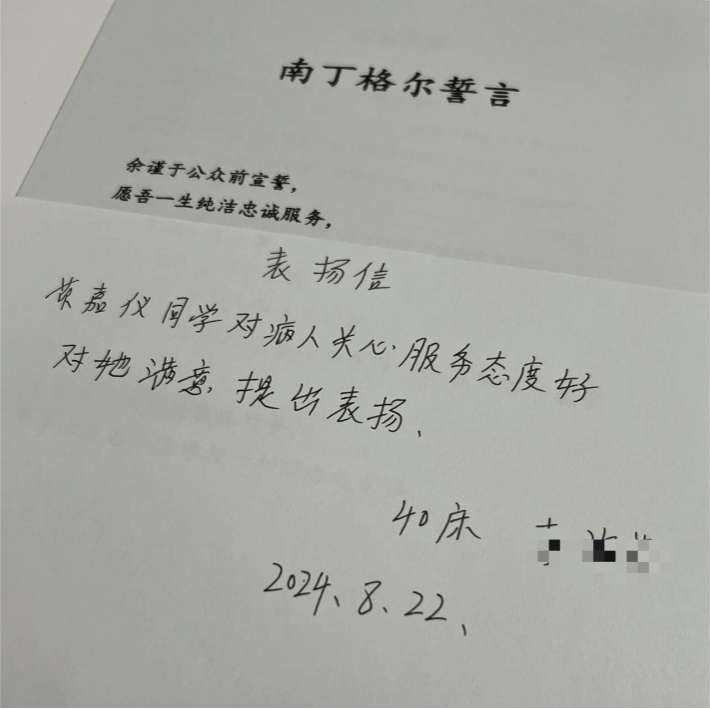转战妇科,我遇到了另一位经验丰富的带教老师——侯宇婷老师。在她的指导下,我学会了在尊重并保护患者隐私的前提下,用温柔的话语和专业的态度缓解她们的焦虑与不安。老师认真把关我操作中的每一个细节,一针见血地指出我的问题所在,并耐心解释每个操作的目的和意义,让我深刻体会到护理工作的严谨与细致。在这里我收获了实习生涯中第一封患者手写的实名表扬信,这是对我实习工作的鼓励与肯定。这段经历不仅让我学会了如何用心去倾听、理解患者,更让我认识到我们要关爱女性健康,要多关爱身边的女性,比如自己的妈妈。我喜欢看大家的眼睛,因为可以从她们眼里看到的是女性独有的温柔与坚韧,以及她们在面对癌症时所展现出的无畏勇气,同时,我也见证了在她们身边,家人之间的亲情与温暖。