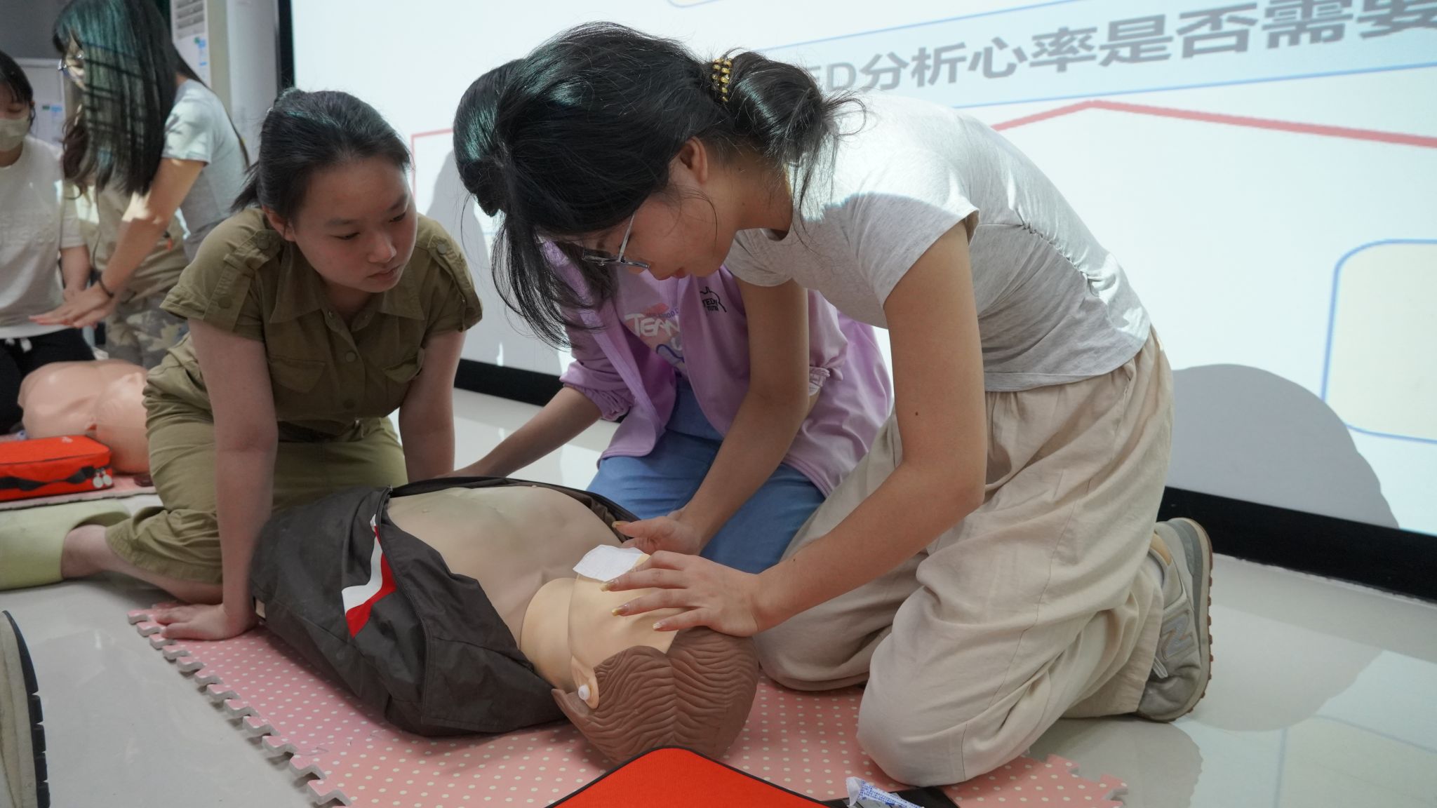 理论讲解后,佘芊睿同学借助模拟人教具进行全流程实操演示。她边操作边拆解技术要点:“手臂必须垂直于胸壁,利用核心力量向下按压”“每次按压后要确保胸廓完全回弹”,清晰的动作示范与细节指导,让抽象的急救知识转化为可操作的肌肉记忆。