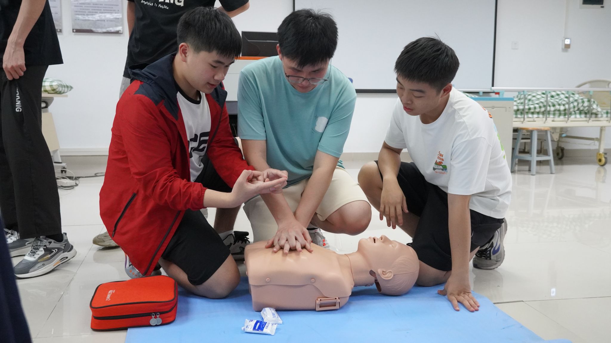 在分组实操环节,同学们轮流在模拟人上进行完整流程演练。担任指导的小老师全程观察,及时纠正按压位置偏移、力度不足、手臂角度偏差等常见问题。练习尾声,一位同学主动申请现场示范,她动作规范、节奏稳定,从判断环境到完成30次按压接2次通气的连贯操作,赢得在场同学的肯定。