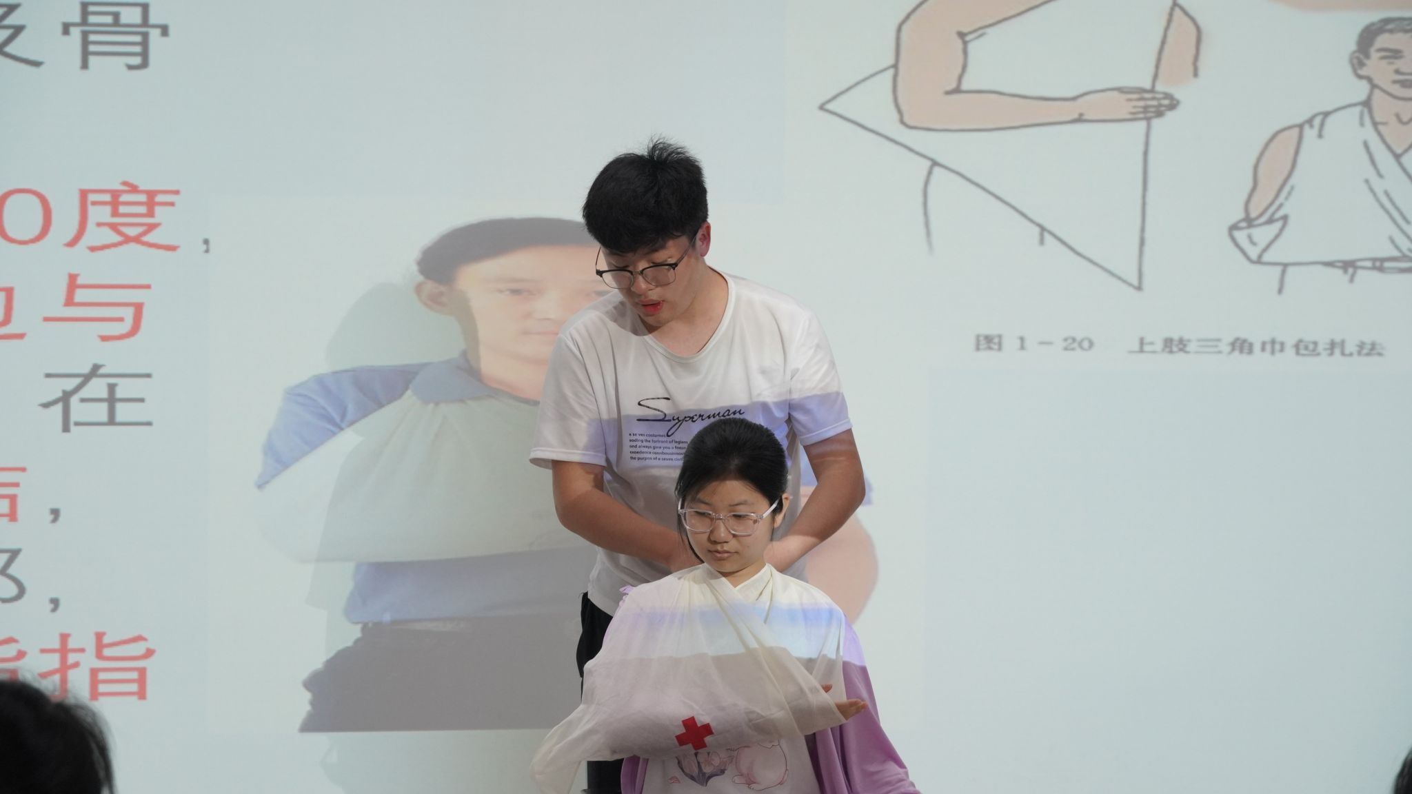 在生活中,意外总是不期而至,而掌握急救包扎技能,就如同为生命构筑了一道坚实防线。小老师李远明展示了世界卫生组织的统计,其中数据显示,在各类死亡因素中,创伤导致的死亡率高居首位,并向同学们解释了包扎伤口的重要性。小老师从伤口的分类和成因入手,深入浅出地讲解了各类伤口的处理方法,他还详细介绍了各种包扎技巧,包括如何正确地使用绷带、如何调整松紧度等。