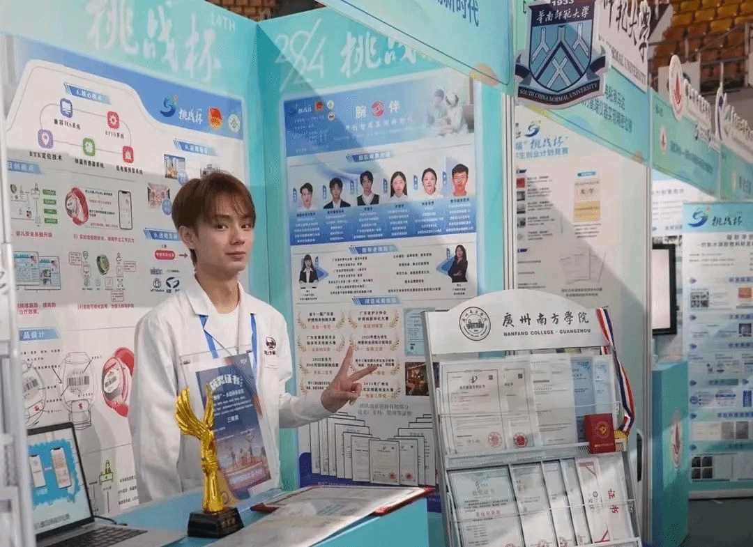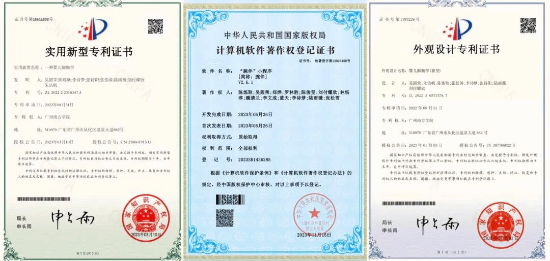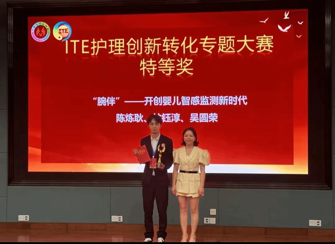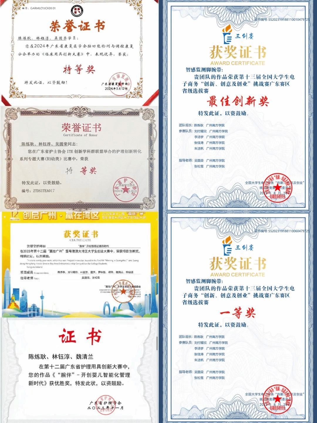 在校期间曾担任学院艺术团团长,康语主持队队长,校青志公关部部长;获得荣誉33项,其中,创新类省级奖项15项,另获批国家专利3项,软件著作权1项。他所负责的项目《“腕伴”——开创婴儿智感监测新时代》(以下简称“腕伴”)更是斩获了六项大奖:第十四届“挑战杯”广东大学生创业计划竞赛省赛银奖、广东省护士协会ITE创新学科群联盟——护理创新转化系列专题大赛(妇幼类)比赛特等奖、2024年广东省康复医学会临床用具创新大赛特等奖、2022年广东省第十一届护理用具创新大赛一等奖、第十三届全国大学生电子商务“创新、创意及创业”挑战赛广东赛区“中国电信杯”选拔赛最佳创新奖、第十三届全国大学生电子商务“创新、创意及创业”挑战赛广东赛区“中国电信杯”选拔赛一等奖。