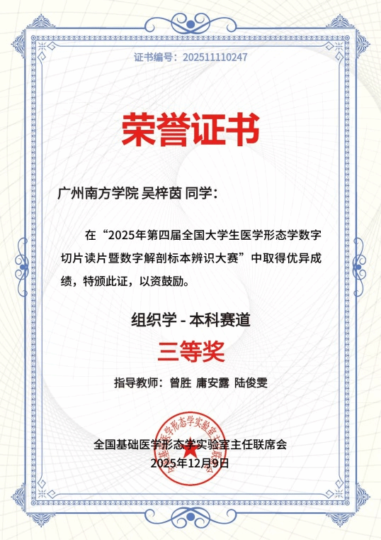 高等医学院校大学生数字形态学读片和数字解剖标本辨识技能大赛作为全国基础医学领域极具权威性与影响力的顶级赛事,以高规格、高难度、高竞争力闻名业界。赛事秉持 “以赛促教、以赛促学、以赛促改、以赛促建” 的核心宗旨,覆盖人体解剖学、组织学、病理学、寄生虫学等五大核心赛道。第四届全国大学生形态学大赛吸引了全国 220 所高校的 12.7 万名学生同台竞技,历经 1100 场次初赛的层层筛选,最终 1.7 万余名学子成功晋级决赛。 在公办院校占据竞争优势的格局下,金年会 24 级学生吴梓茵凭借扎实的专业基础与稳定的临场发挥逆势突围,一举斩获组织学赛道三等奖!这不仅是金年会在组织学赛道斩获的首个全国性奖项,更是我校在本届赛事中唯一的获奖成果,我校也因此成为获奖名单中为数不多的民办院校代表。金年会学子以硬核专业实力打破赛道壁垒,创下学校在全国性基础医学学科竞赛中的突破性新成就!