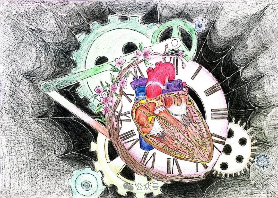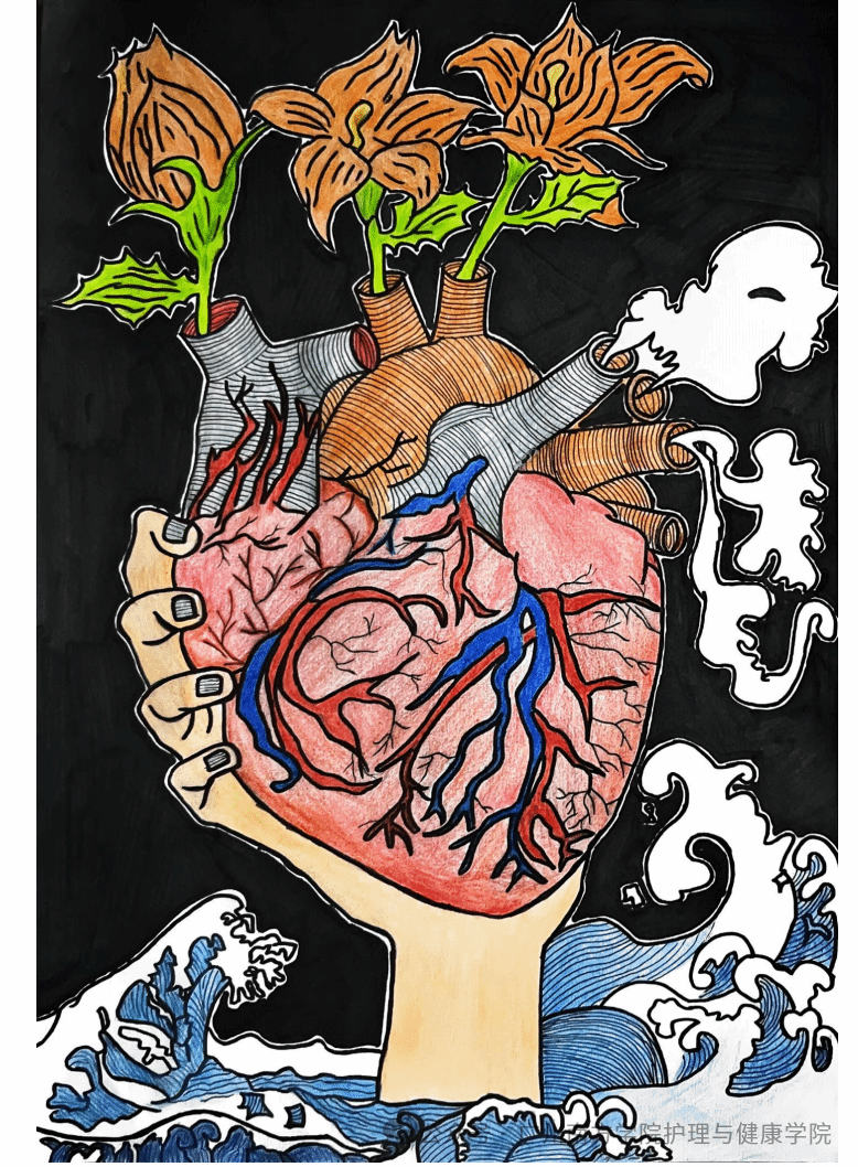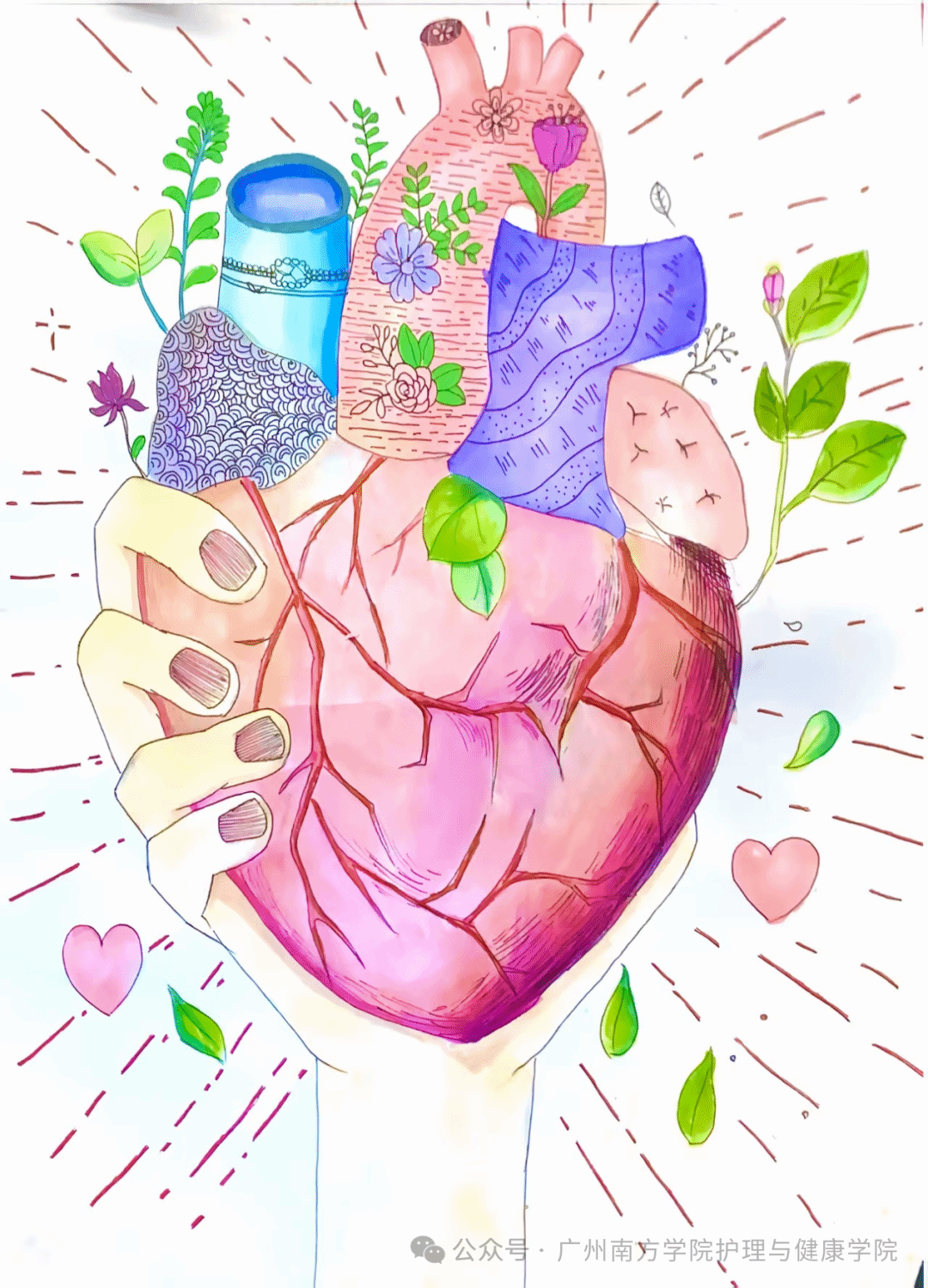 作品介绍:本作品以心脏为核心元素,聚焦当代人因生活压力大、熬夜成习而频发的心脏健康问题,旨在呼吁大众重视心脏健康。画面中,一只手稳稳托住心脏,象征人们对心脏健康的主动呵护,强调个体在维护心脏健康过程中的责任与力量。画面点缀绿植与花朵:绿植寓意健康生活方式,如适度运动、亲近自然,这些积极习惯恰似养分滋养心脏;花朵则象征美好与希望,传递出心脏健康带来的愉悦与活力。呼吁人们重视心脏健以积极的生活态度和行动,守护这台维系生命的“发动机”。