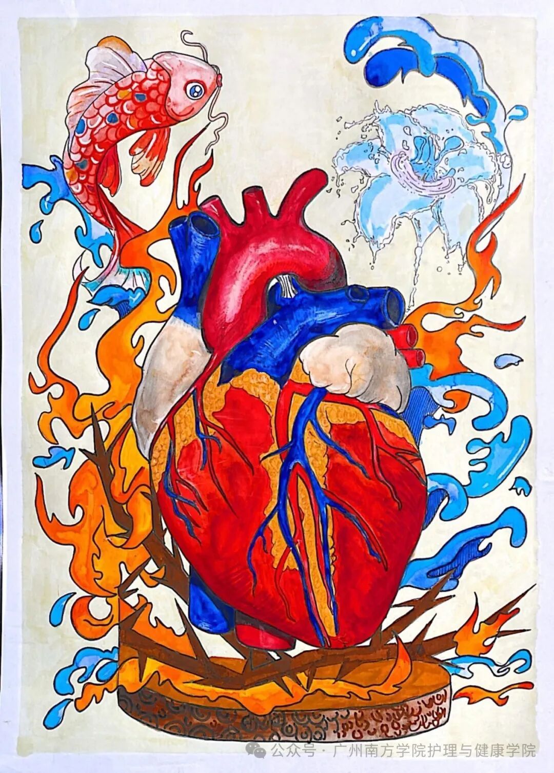 作品介绍:这幅画以人体心脏为核心元素,心脏以写实风格呈现,鲜明的红色与蓝色血管交织,展现生命动力。周围火焰与水波环绕,火焰象征激情、能量与内心炽热情感,水波寓意灵动、变化与情感的流转。锦鲤在中国文化中代表吉祥、富足与好运,增添画面祥瑞气息,也可能暗示内心的美好愿景。底部带刺物体或许象征生活阻碍与挑战。整体画面通过这些元素融合,传达出在生活挑战下,内心如火焰般炽热、似水波般灵动,既有对美好愿景的向往,也有对生命力量的歌颂。