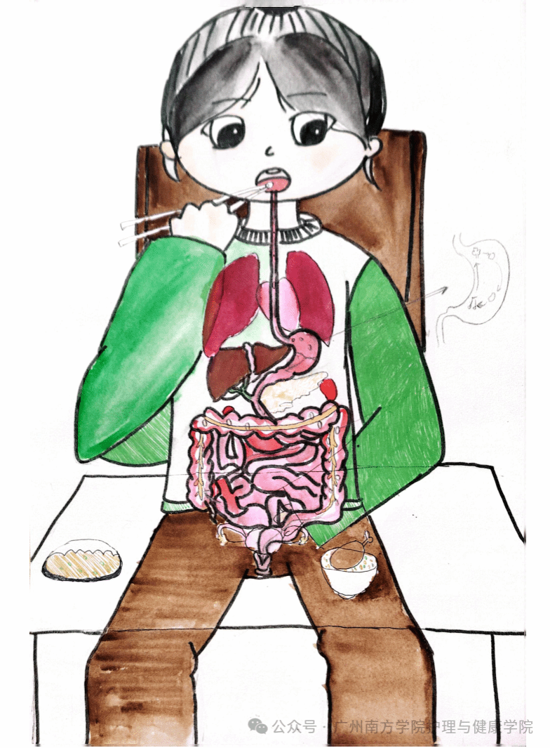 作品介绍:此作品以独特的艺术视角,构建了一个将人体胃部消化过程类比为厨房烹饪的微观世界。画面里,胃幻化为精密运作的“消化厨房”,贲门、胃底等解剖结构巧妙化作厨房分区。咀嚼后的食物经食管入场,恰似新鲜食材被送入后厨。胃凭借蠕动与胃酸分泌等生理活动,如同运用炉灶火候与烹饪技法,对食物进行精细 “加工”。食物在这个 “厨房”中经历物理与化学变化,逐步被分解。而最终的剩余残渣进入肠道,如同厨房清理残余物料。作品通过生动的画面语言,融合医学知识与艺术想象,不仅揭示人体消化奥秘,更展现生命微观进程中精妙的 “膳食艺术”,是科学与艺术跨领域交融的生动诠释。