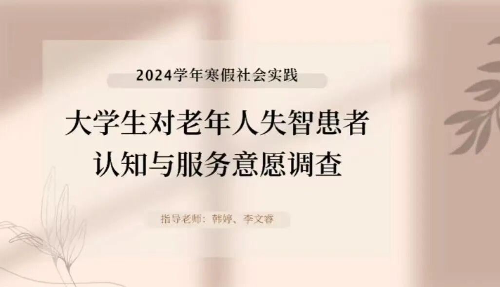 韩婷、李文睿老师指导的调研主题为“大学生对老年人失智患者认知与服务意愿调查”。会议中,李文睿老师向同学们详尽地阐述了本次调查的背景、失智症的概念及失智症的处理原则。当下失智症面临低知晓率、低诊断率、低治疗率的“三低”困境,严重影响老年人生活质量与社会参与度,已成为公共卫生重点问题。此次调查意在帮助同学们深入了解失智症的基本知识、症状识别、治疗方法和护理要点,同时领会患者及照护者的困境,增强对这一社会群体的关爱和自我的社会责任感。