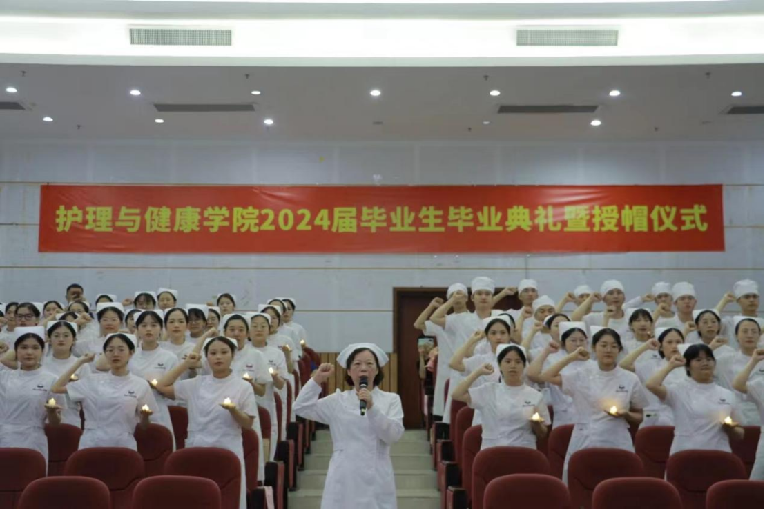 授帽仪式结束后,全体毕业生在覃惠英主任护师的带领下宣读南丁格尔誓言。同学们手持蜡烛,举右手握拳,字字铿锵,句句坚定,诵读誓言,在誓言中感悟“凝仁爱之心、聚守护之力、促人类健康”的神圣职责与忠心使命。