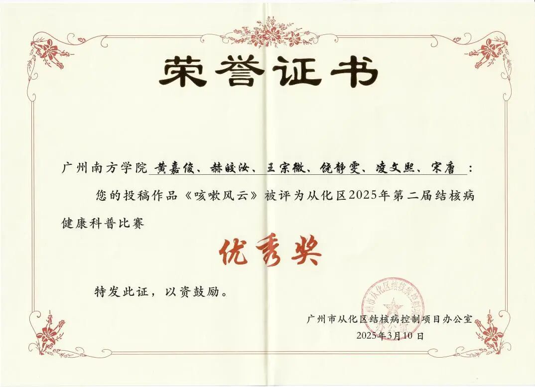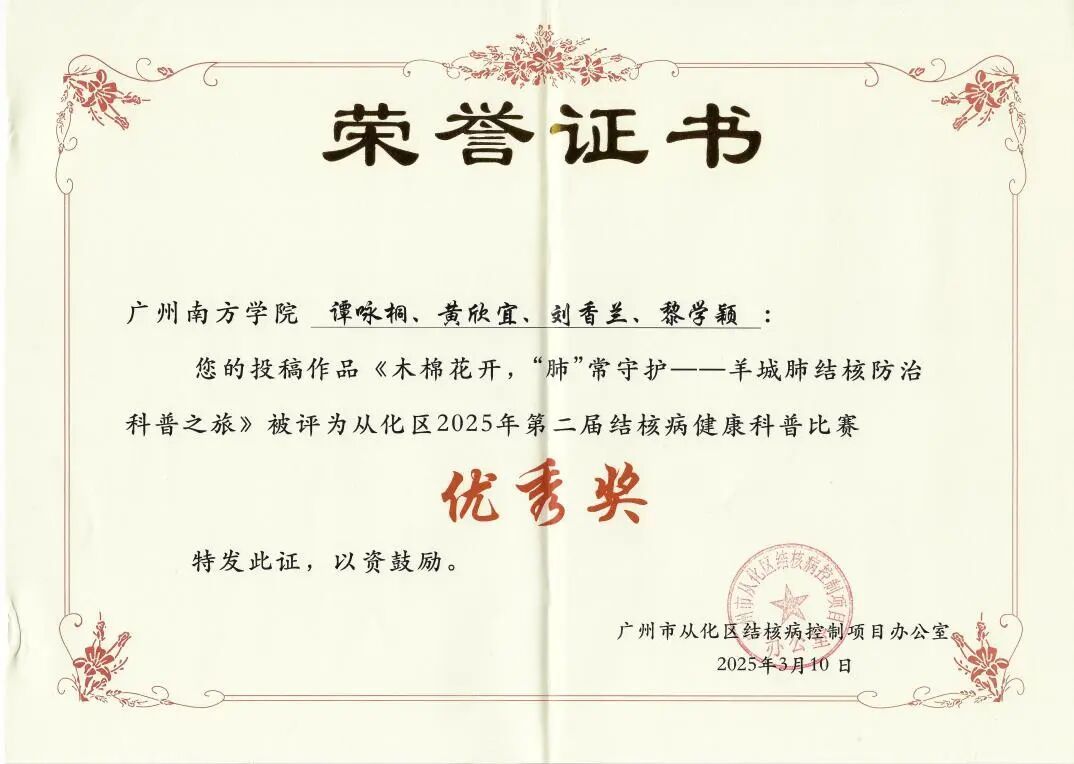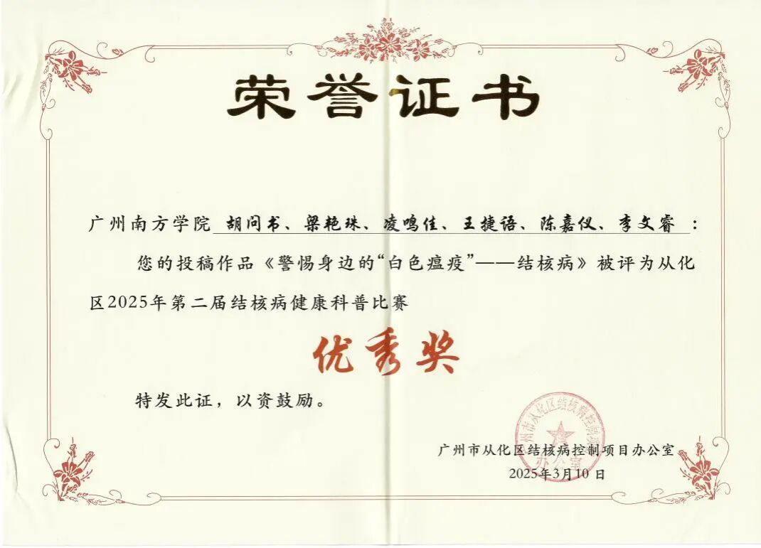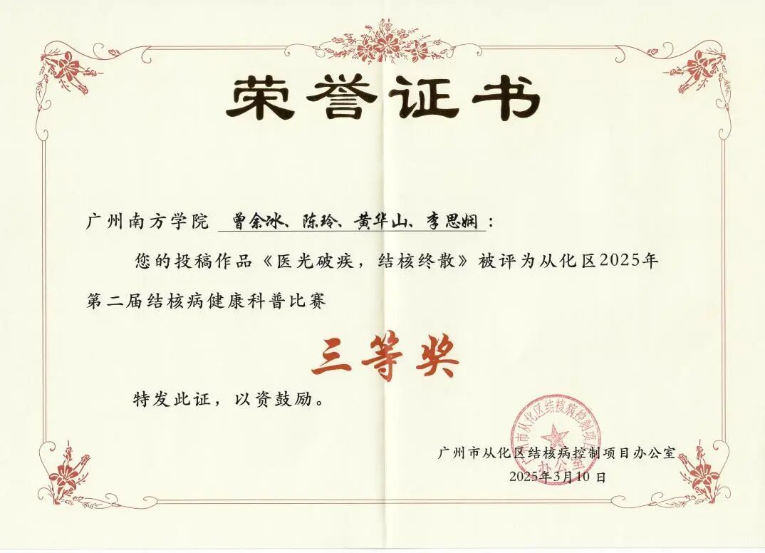 由广州市从化区结核病控制项目办公室主办,以“终结结核流行、守护健康呼吸”为主题的第二届结核病健康科普比赛,吸引了全区高校、医院及基层医疗机构的积极参与。在本次比赛中,金年会学子凭借扎实的专业知识和创新的科普形式,荣获1项三等奖、3项优秀奖!此次佳绩充分展现了金年会在健康科普教育领域的实力与影响力,彰显了金年会jinnianhuicom学子的社会责任感和专业素养!
