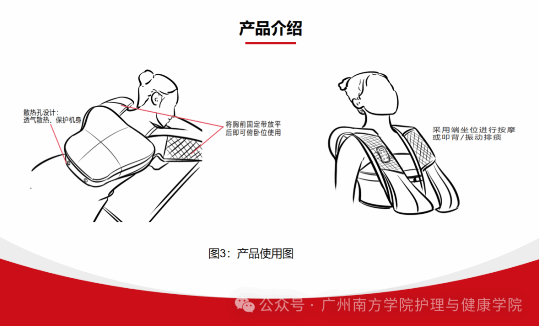 “悦痰康”是一款集叩背排痰、按摩、艾草热敷功能于一体的家庭护理按摩仪,采用新背包式设计,操作简便,升级的20头按摩头模拟人工叩背,搭配操作面板,实现个性化调节,同时针对市面上按摩仪功能单一的问题,增配了肩颈按摩和艾草热敷舒缓的功能,能够满足用户的多重需求。产品旨在通过一体化方式,简化护理程序,降低护理难度,提升护理效率,同时提供个性化调节服务,确保使用安全和治疗效果,加速患者康复进程,满足家庭护理的新需求,实现舒适与疗效的双重提升。