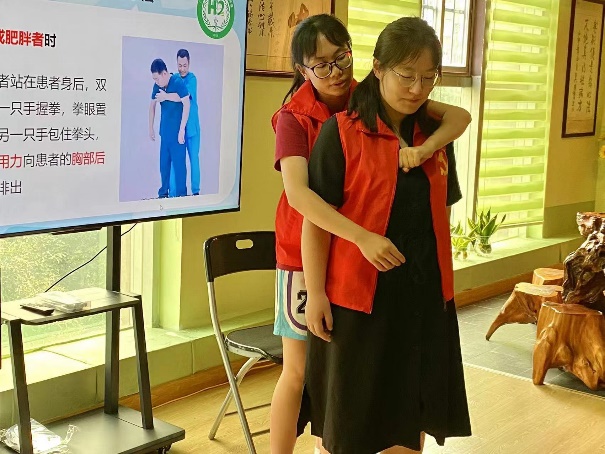 贾鸿歌和赵珍赢同学采用理论与实操相结合的方式,示范“海姆立克”急救法的原理和操作。黄青霞同学结合真实案例,细致讲解心肺复苏按压手法和AED除颤仪的使用方法,提升学员面对突发危险情况的应对能力及自救和互救技能。