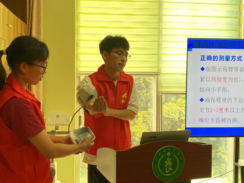 很高兴有这样的外出机会,这也是自己在广州参与的第一次外出志愿活动。在广州养生协会给爷爷奶奶们做测血压的培训,期间收获颇多,在PPT、演讲和沟通交流上提升了很多,同时还有许多的不足,感受到了灵活运用平时学的理论和实践的重要性。在师姐和同学们在现场的表达交流上也收获了很多技巧。希望以后自己能够多参与这样的外出活动,不断的锻炼提升自己。