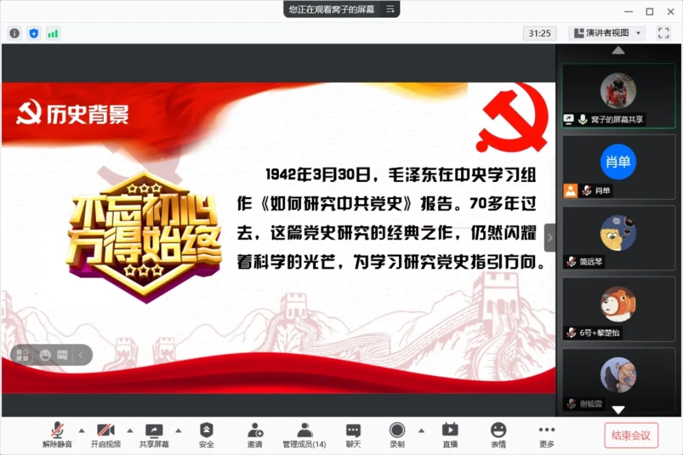 第五组的同志们通过腾讯会议开展线上学习党史活动,从党史“是什么”延展到“怎么做”展开讨论、学习。同志们表示,要准确把握党史的主题主线,树立正确党史观,反对历史虚无主义,联系实际学好用好党的百年历史。