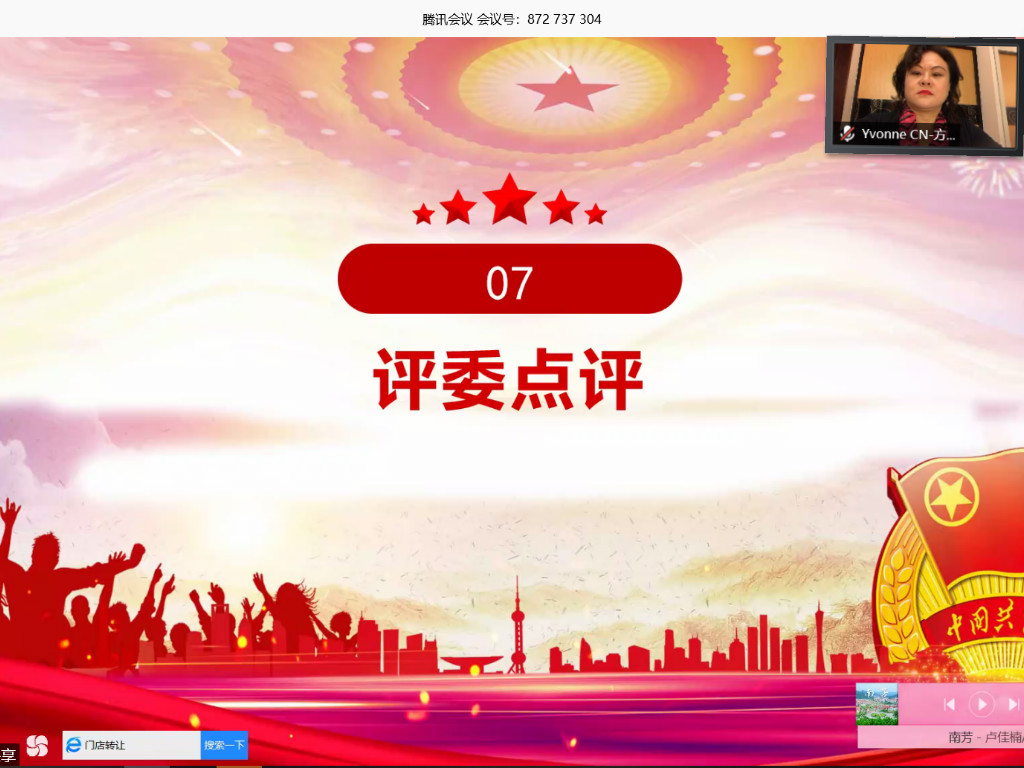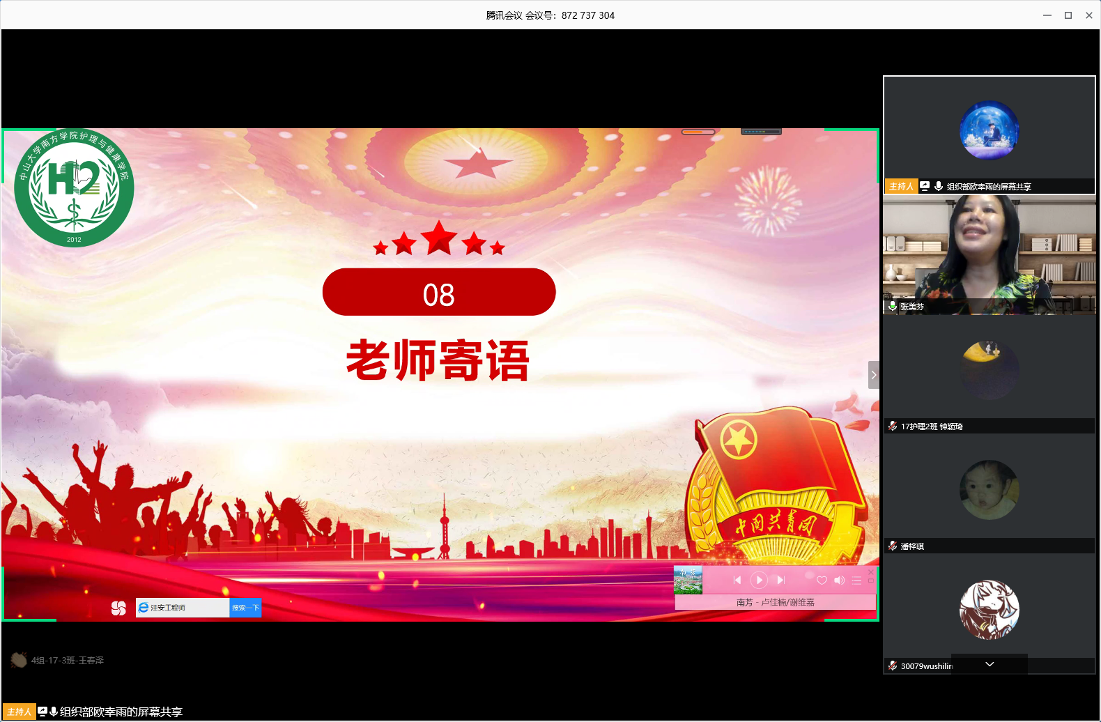 伴随着共青团团歌的奏唱,林晓兰老师为本次大会致辞。林老师说道,在疫情期间,金年会各级团组织在党组织的带领下积极开展线上活动。在学院的领导下,团结广大青年党员、青年团员为打造南院特色贡献了自己的力量。通过此次会议,希望各团支部总结以往的经验与不足,互相交流学习,取其精华,去其糟粕,继承发扬五四精神,共同将团支部建设得更好。