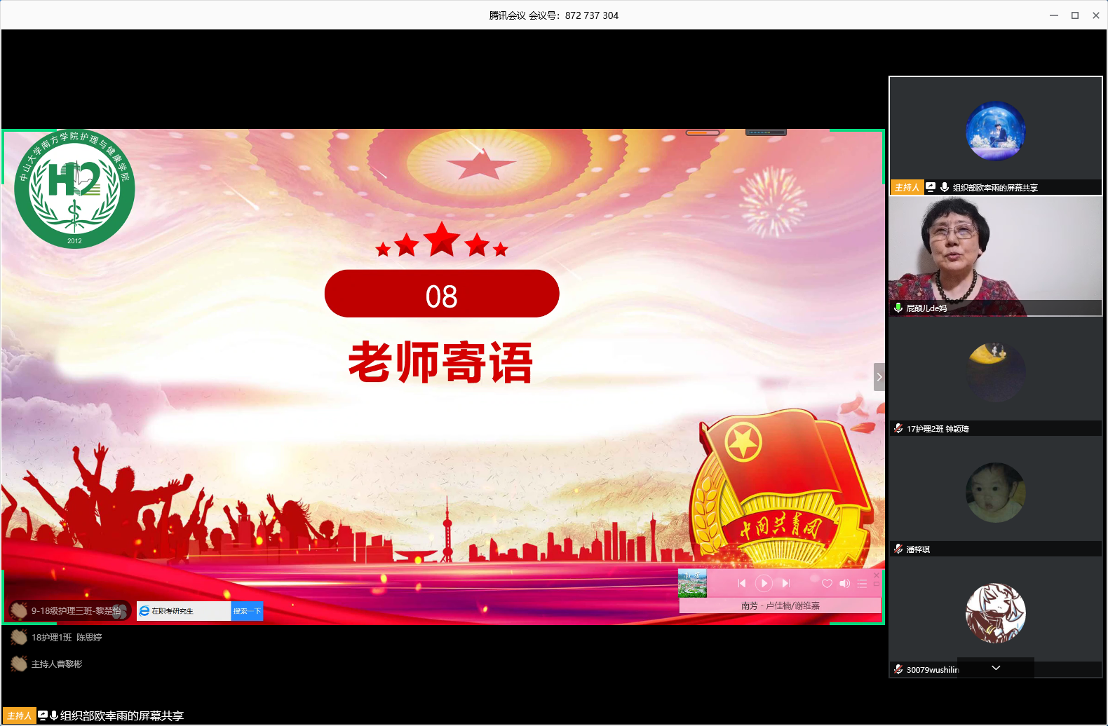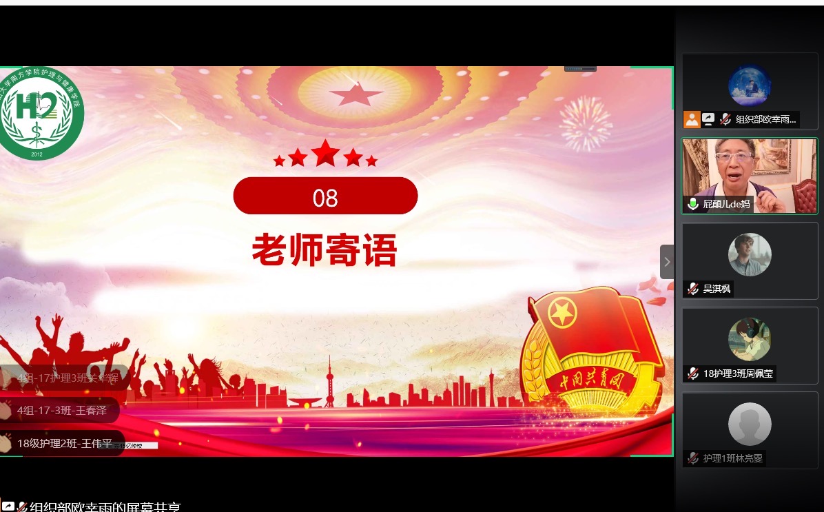 在汇报过程当中,大会有幸与我校喻世友校长连线。喻校长鼓励护理学子努力学习专业知识,为日后的护理工作打下坚实的基础,发扬五四精神,尽情展现护理学子的责任和担当。喻校长还提到,在新冠肺炎疫情期间看到了金年会jinnianhuicom学子的青年活力,他表达了对护理学子的关心,同时给予厚望,号召金年会jinnianhuicom师生为学校新冠肺炎疫情防控工作贡献力量。