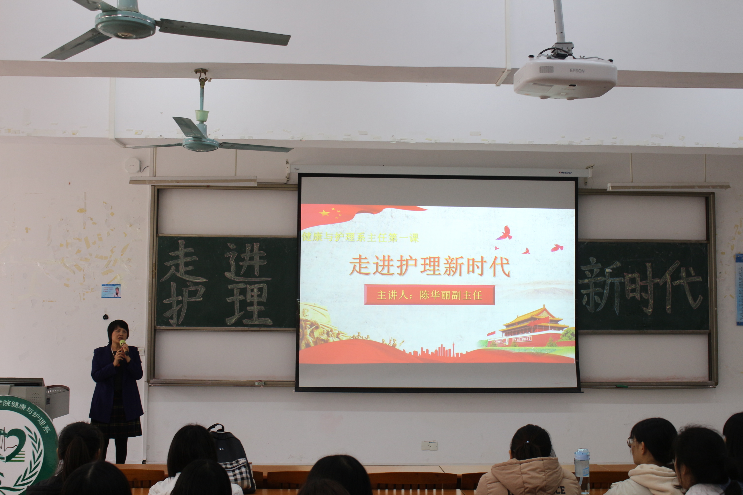 为深入贯彻落实全国教育大会习近平总书记重要讲话精神,培养学生成为德业双修”的新时代的护理人,2月27日中午12点30分,健康与护理系于5教205开展了新学期主任第一课,我系陈副主任为同学们作了题为“走进护理新时代”的专题讲座。健康与护理系两办教师和部分专业教师到场聆听,2016级、2017级和2018级的全体同学积极参与,全场座无虚席。