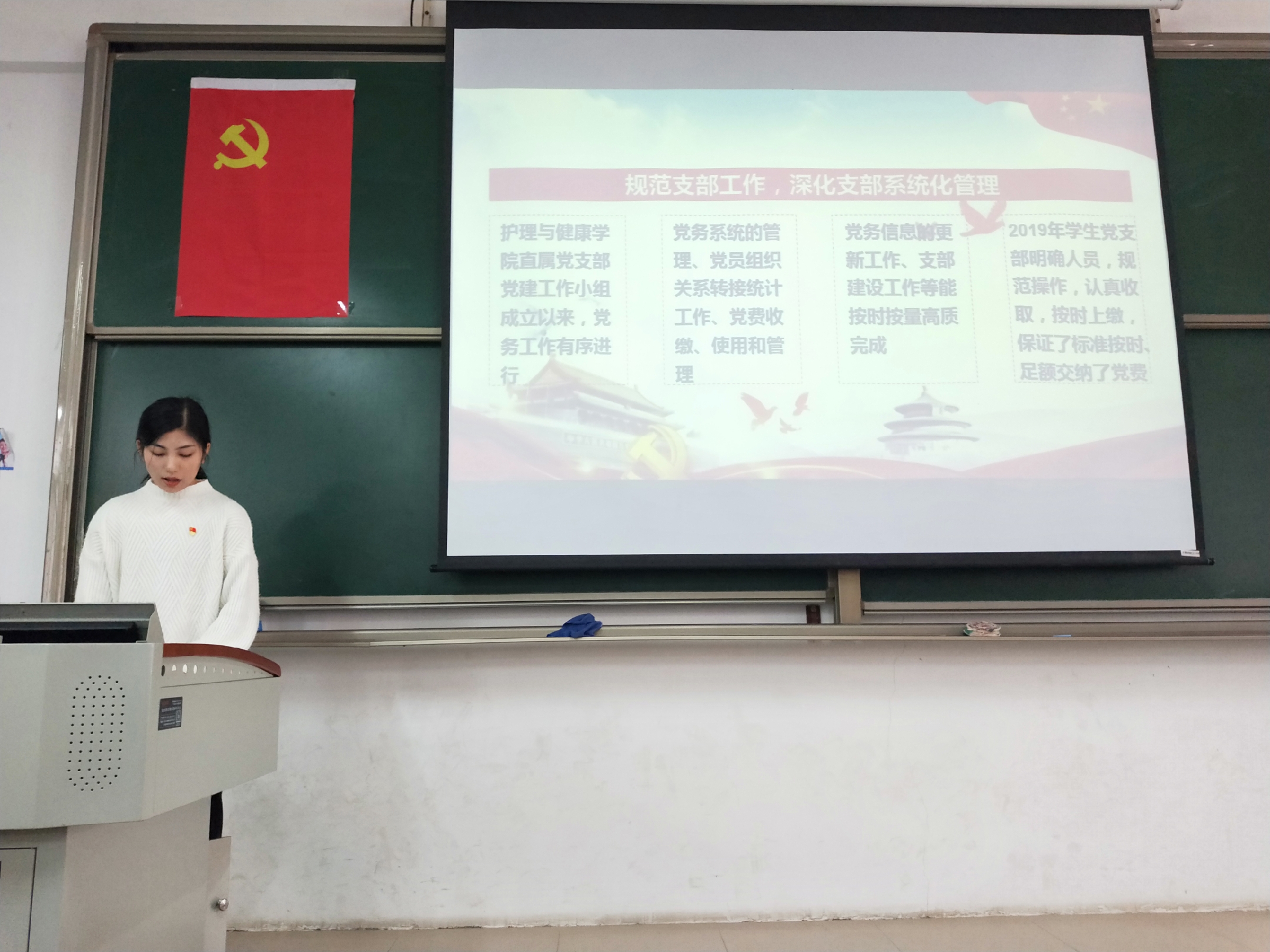 学生党支部首先做好支部政治建设,积极组织“不忘初心、牢记使命”主题教育活动,2019年度学生党支部累计组织支部成员线下理论学习18次,线上学习10余次,外出的主题教育活动2次,通过专题学习分享会、主题演讲与朗诵、观看记录片专题片、易班APP、学习强国APP的使用、党日活动等丰富活动形式来提高支部成员政治思想水平。其次,扎实推进基层党建工作,包括入党积极分子培养考察、选拔发展对象、做好接收中共预备党员和中共预备党员的转正工作;联系实际,落实“三会一课”制度;推进党建工作品牌化,严格党员发展程序,结合专业特色,发挥支部成员先锋模范作用。第三,突出问题和整改措施,例如入党积极分子的教育活动形式创新方面还需向多元化发展等。
