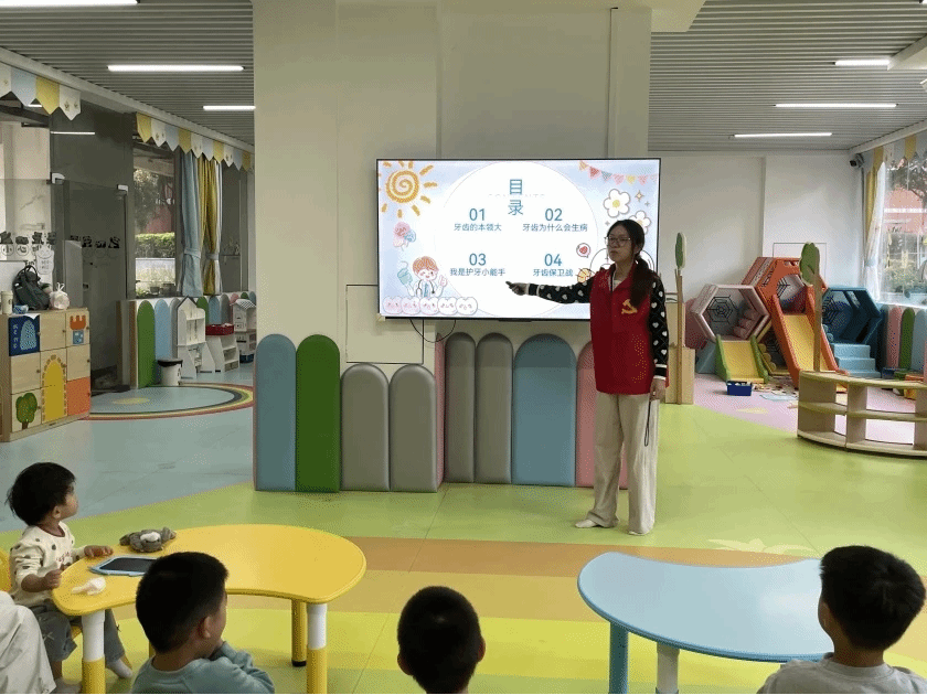 主讲人张嘉睿同学抛出趣味谜语,孩子们在欢乐抢答中解锁护牙新知识。她向孩子们系统讲解牙齿在咀嚼食物、辅助发音以及维持面部美观中的重要作用,结合日常生活场景的举例、观看相关视频,让孩子们直观理解牙齿对身体健康的重要性,进一步激发他们对口腔健康的兴趣。