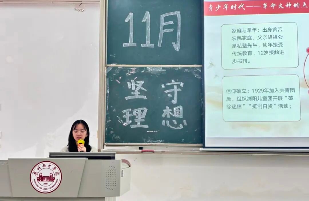 为强化学生党支部成员的思想建设,筑牢理想信念根基,传承并弘扬胡耀邦同志的革命精神,金年会jinnianhuicom学生党支部于11月27日在10教106室开展“坚守理想,勇担使命——胡耀邦同志精神的时代回响”主题党课。本次党课由戚晓韵老师主讲。