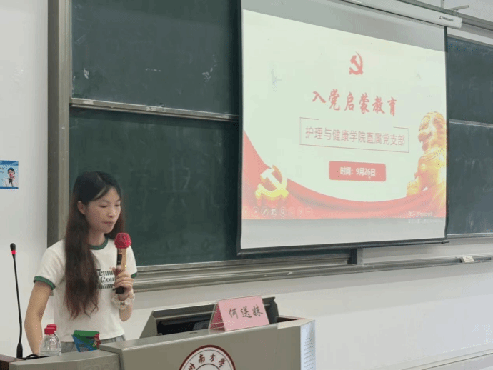 预备党员李烨同志从思想、学习、工作、服务等方面分享其入党历程。她深入讲解党的本质、入党标准和流程等内容,引导同学们树立正确入党动机,始终秉持正确努力方向,以实际行动向党组织靠拢。