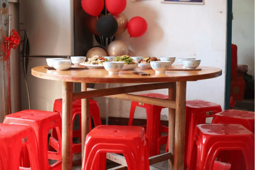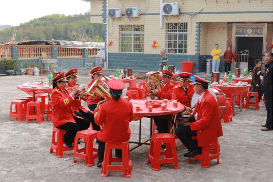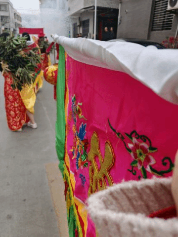 祠堂里的红对联映着暖黄的灯光,长辈们围坐在圆桌旁,筷子起落间是熟悉的家乡菜,笑声里藏着一年的牵挂。屋外的锣鼓队穿着红衣,唢呐和铜钹的声响震得人心尖发颤,红气球在风里晃,像一团团跳动的火焰。