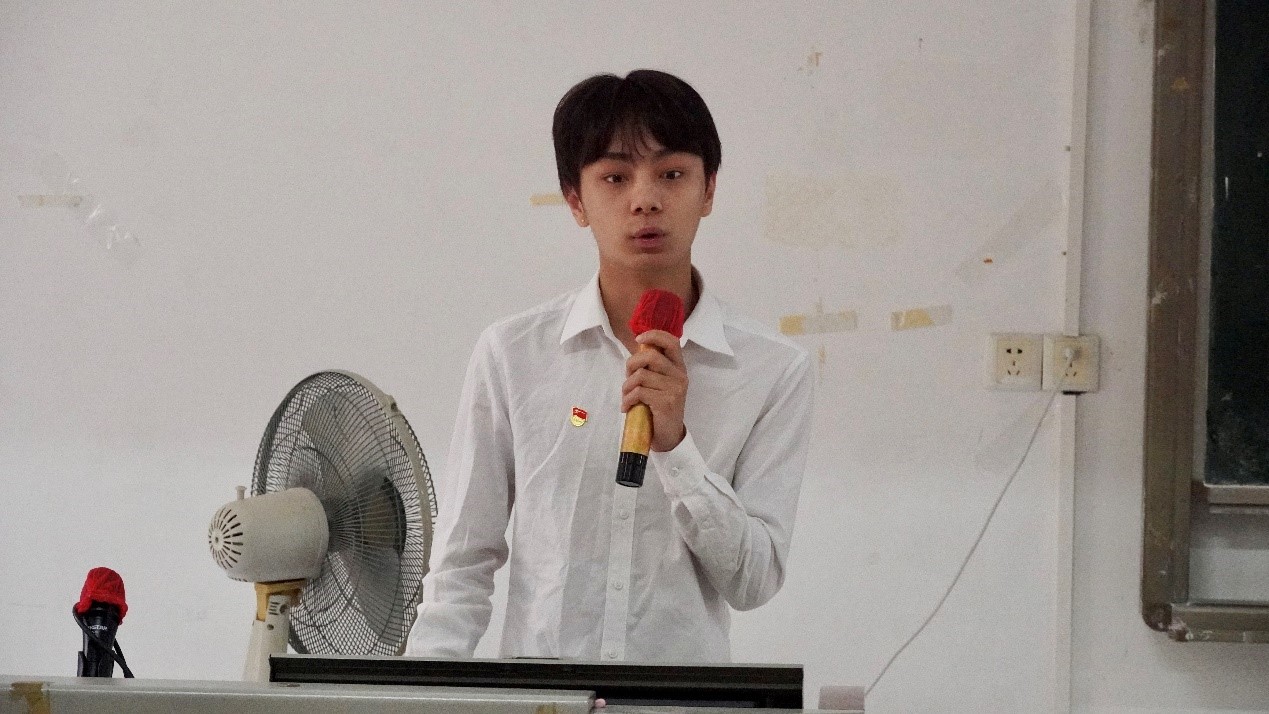 陈炼耿同学从“党员介绍”“聆听党员故事”“观后感分享”“红色基因的传承”四个方面展开讲述。他介绍了黄文秀带领乡亲们脱贫攻坚的感人事迹,激励和引导同学们以黄文秀为榜样,志存高远,不负韶华,以昂扬的锐气奋斗新时代,展现新作为。他提到,一代人有一代人的长征,一代人有一代人的担当,正是因为有像黄文秀一样的倾情投入、奉献自我的青年党员,把脱贫攻坚的责任扛在肩上,把脱贫攻坚的任务抓在手里,才能开启脱贫致富的长征路途。扶贫之路在于青年,乡村振兴离不开我们青年,作为新时代中国青年的我们,应向黄文秀同志学习,勇立时代潮头,争做时代先锋!