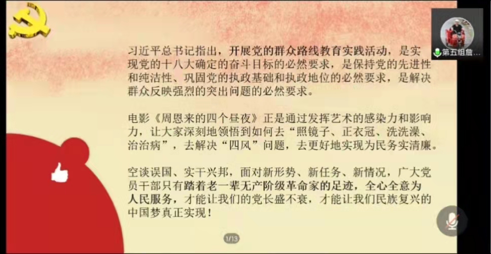 第五小组的代表人詹燕婷同学分享《周恩来的四个昼夜》的观影心得。通过影片中两个镜头的对比,我们深深地感受到了那个时代的人民对周总理、对党最质朴的情感和最坚定的信仰。同时,她呼吁我们年轻一辈应该积极发扬党批评和自我批评的优良传统,学习全心全意为人民服务的优良作风。