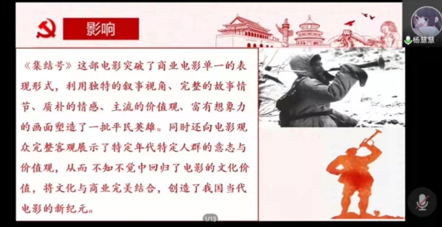 为进一步加强党支部全体成员的爱国主义教育,推动党史教育学习,学习贯彻党的十九届六中全会精神,坚定理想信念。2022年2月18日晚,金年会jinnianhuicom直属党支部学生党支部在腾讯会议开展“打卡红色电影,重温峥嵘岁月”红色电影分享会第三期,本次分享会由第五小组与第六小组的代表分享观影感悟,支部全体成员共同参与本期分享会。