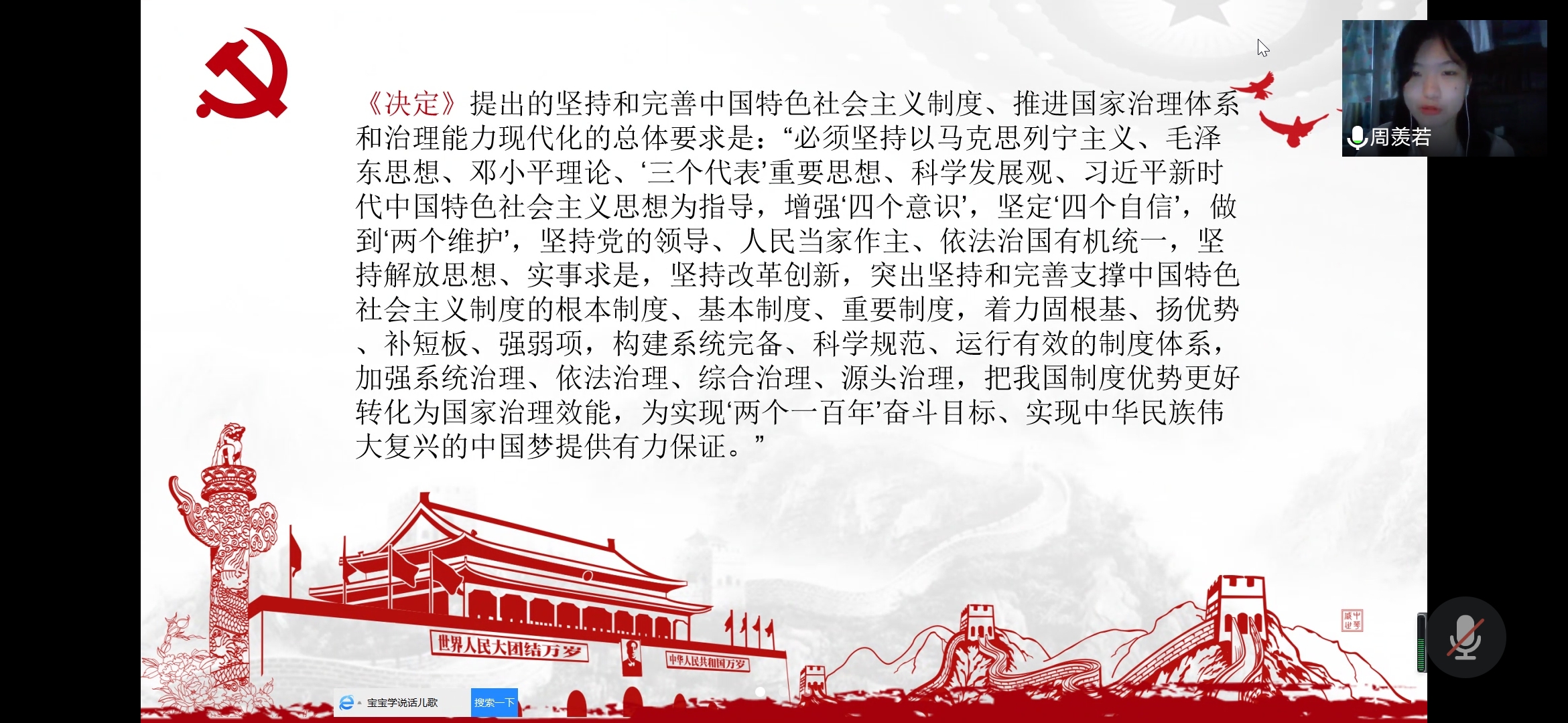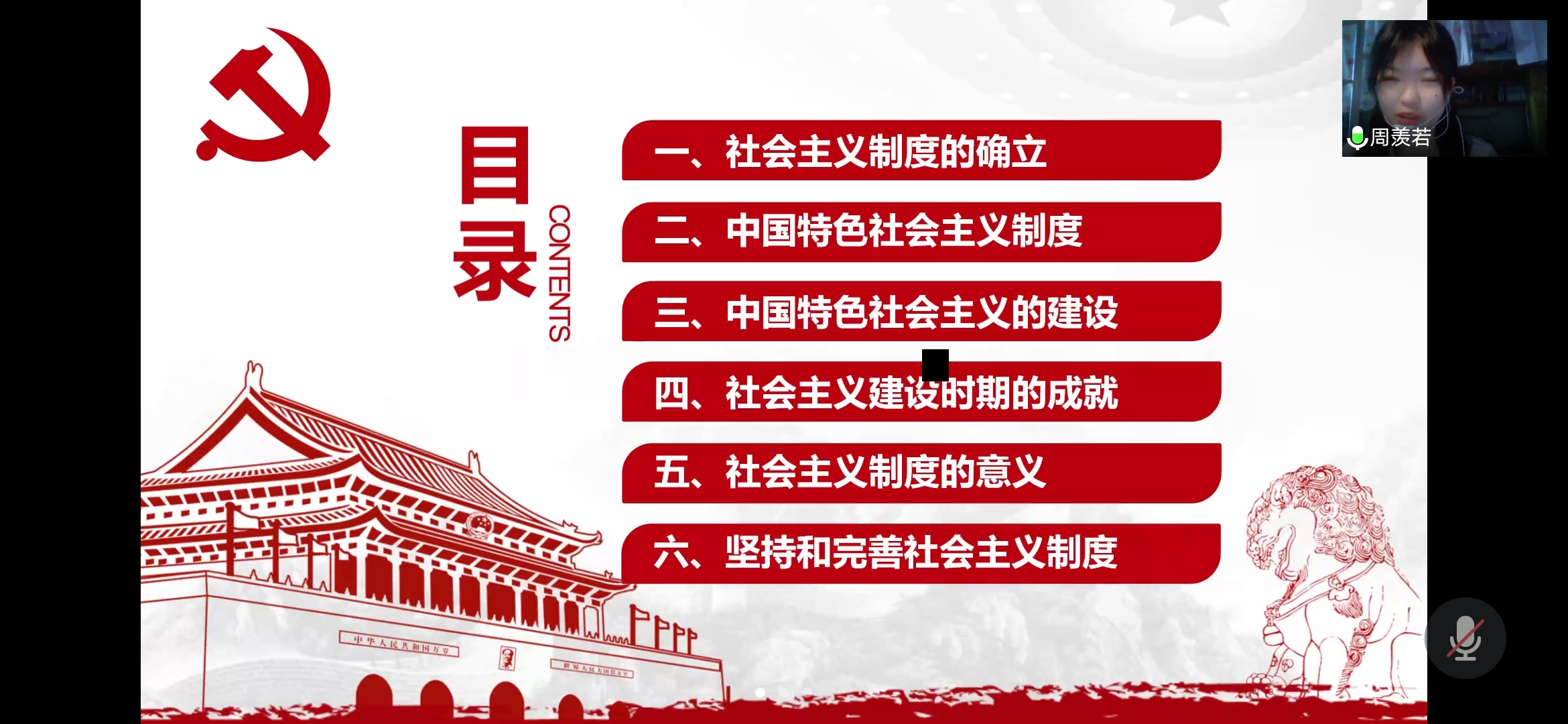 周羡若同志从“社会主义制度的确立”“社会主义建设时期的成就”“中国特色社会主义制度”“中国特色社会主义的建设”“中国特色社会主义制度的意义”“坚持和完善中国特色社会主义制度”六个部分进行阐述。周羡若同志提到,社会主义制度是相对于资本主义制度而言的政治经济制度,其基本要素是实行公有制、实现人民当家作主。在对社会主义制度的探索中,“三大改造”的完成,标志着我国社会主义制度的基本建立,实现了最深刻的社会变革,为中国的进步和发展奠定了良好基础。
