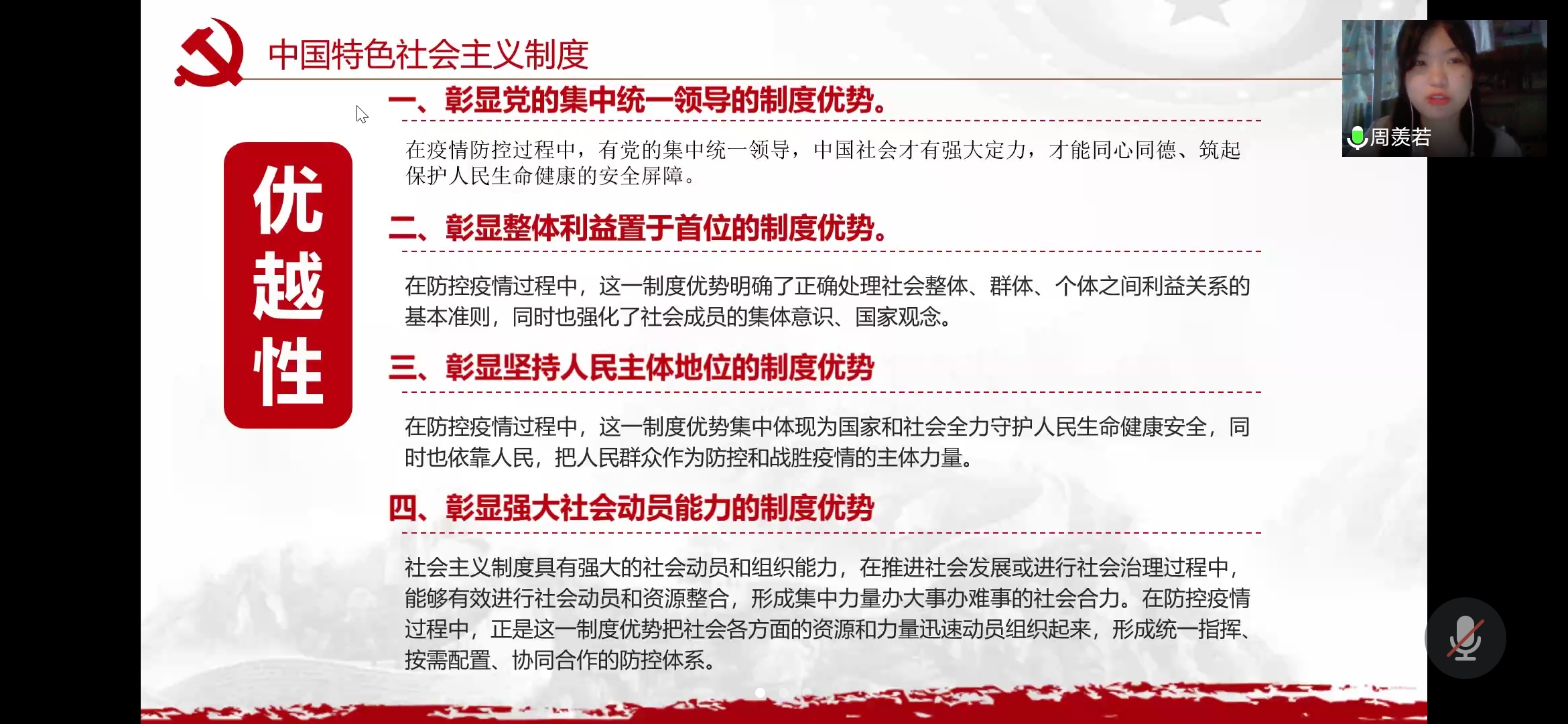 周羡若同志指出,中国特色社会主义制度是当代中国发展进步的根本制度保障,集中体现了中国特色社会主义的特点和优势,其所具有的独特优势,在疫情防控过程中不断彰显,且得到了证明。通过观看视频,引导同学们了解中国特色社会主义制度的由来,意识到幸福生活的来之不易,学会脚踏实地,砥砺前行,积极为祖国未来的发展贡献自己的一份力量。
