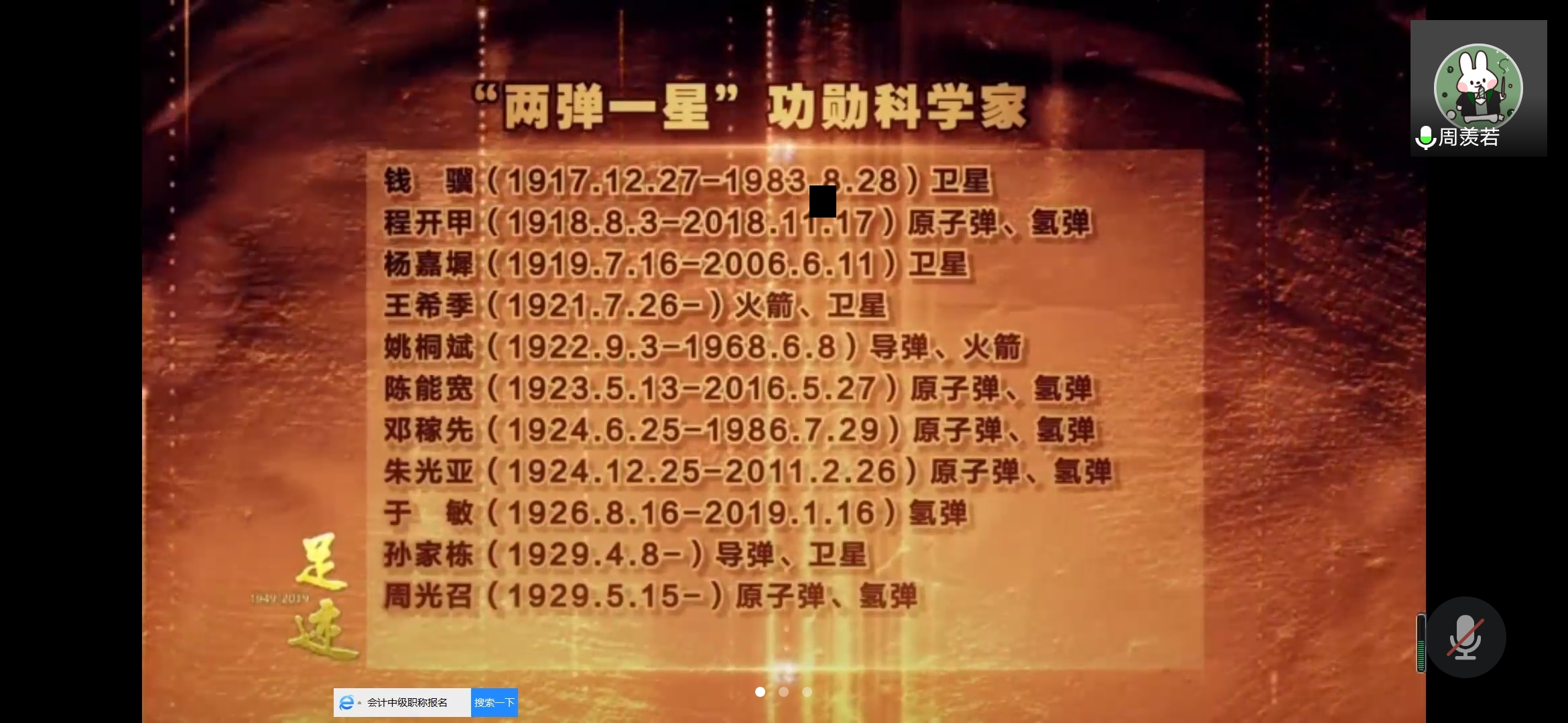周羡若同志详细介绍了我国在社会主义建设时期于钢铁工业、机械工业、石油工业以及科技领域四个方面取得的巨大成就。她通过视频展示了两弹一星的研发对中国产生的重大影响,歌颂了科研工作者为中国科研事业无私奉献的“两弹一星”精神,以此激发同学们爱国爱党的热情。