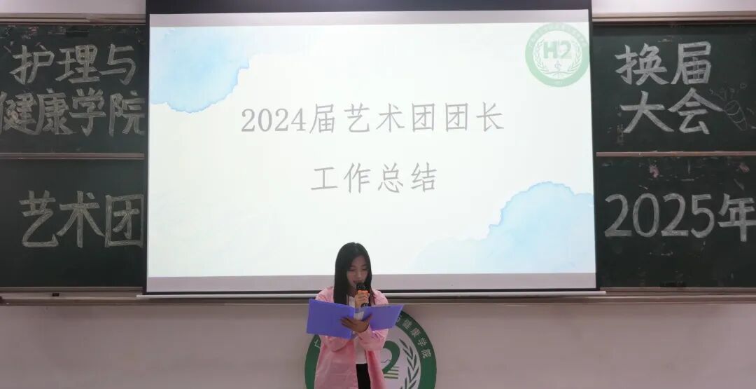 李烨同学代表2024届艺术团团长符诗音作工作总结报告。符诗音学姐从活动策划、活动开展与成效、核心职责履行、专业与艺术融合等方面,呈现了过去一学年艺术团在学院支持和全体成员努力下,各队伍特色活动顺利开展且协作紧密的良好态势。她希望新一届艺术团成员能够在实践中诠释责任与担当,以更鲜活的想法、更饱满的热情,带领艺术团走向新的高度。