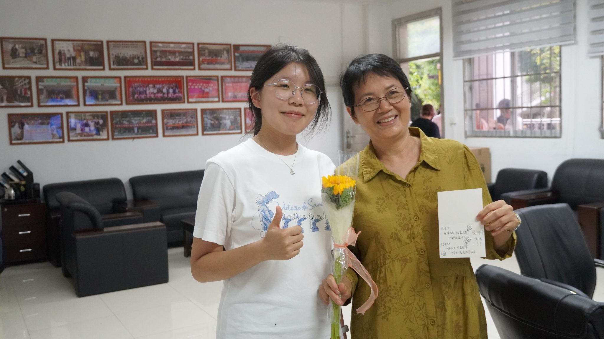 同学们手捧鲜花,带着对老师的敬爱与感恩,走向敬爱的老师。那一朵朵绽放的花,如同同学们心中盛开的敬意之花。当鲜花递到老师手中,师生间的笑容相映,无声的情谊在空气中流淌,这一刻,花香伴着师恩,凝成最动人的画面,诉说着我们对老师最真挚的祝福与感恩。