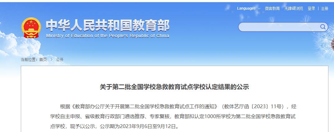 近日,教育部官网公示第二批全国学校急救教育试点学校认定结果,拟认定1000所学校为第二批全国学校急救教育试点学校,我校被成功认定为其中一所!